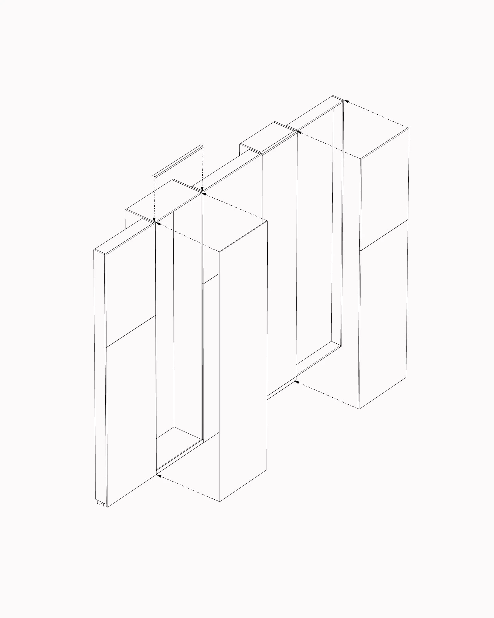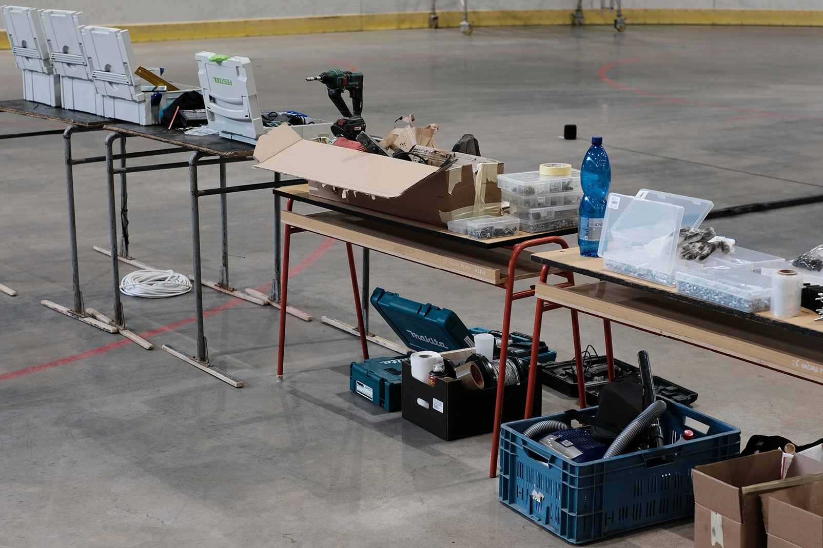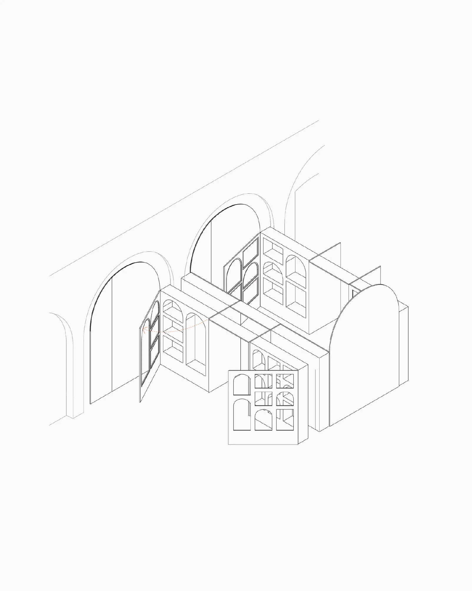 Architektúra výstavy pracuje s motívom transportných debien, ktoré sa po otvorení premieňajú na výstavný mobiliár. Ich robustná konštrukcia, jednotný materiál a sýty odtieň červenej vytvárajú výraznú vizuálnu vrstvu, ktorá kontrastuje s kamennou architektúrou priestoru. Kompozícia pôsobí na prvý pohľad náhodne, no každý objekt má presne určené miesto. Výstavný jazyk tak evokuje dočasnosť, pohyb a neustálu premenu – akoby výstava práve dorazila, otvorila sa a kedykoľvek sa mohla znova zbaliť.