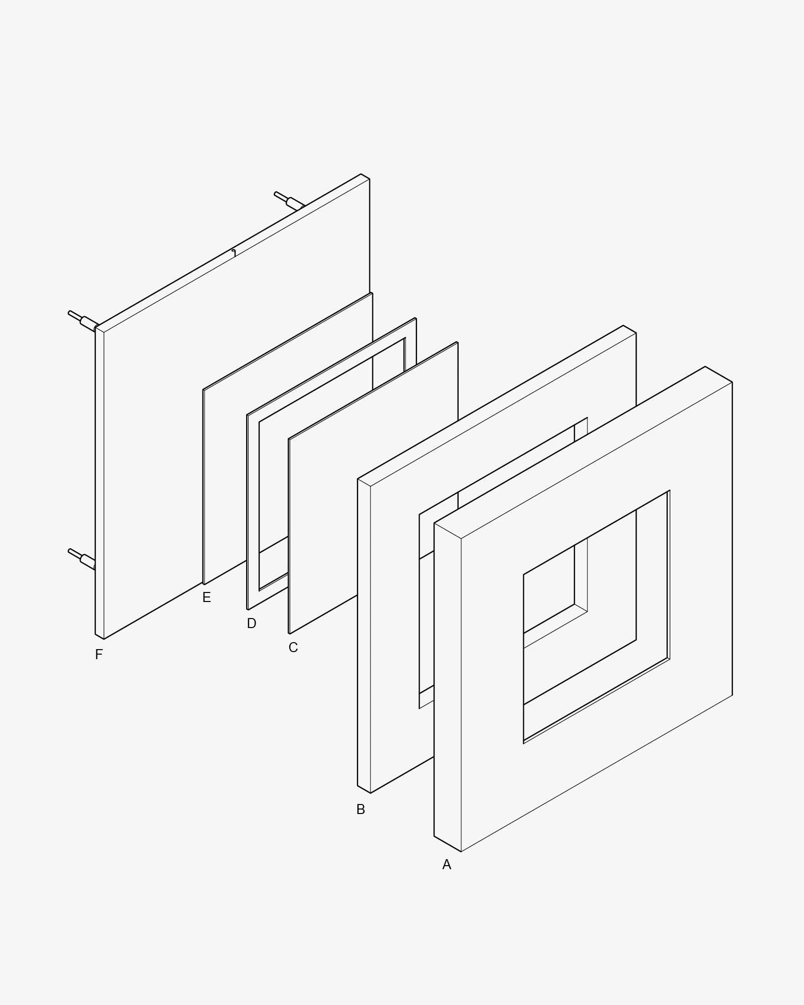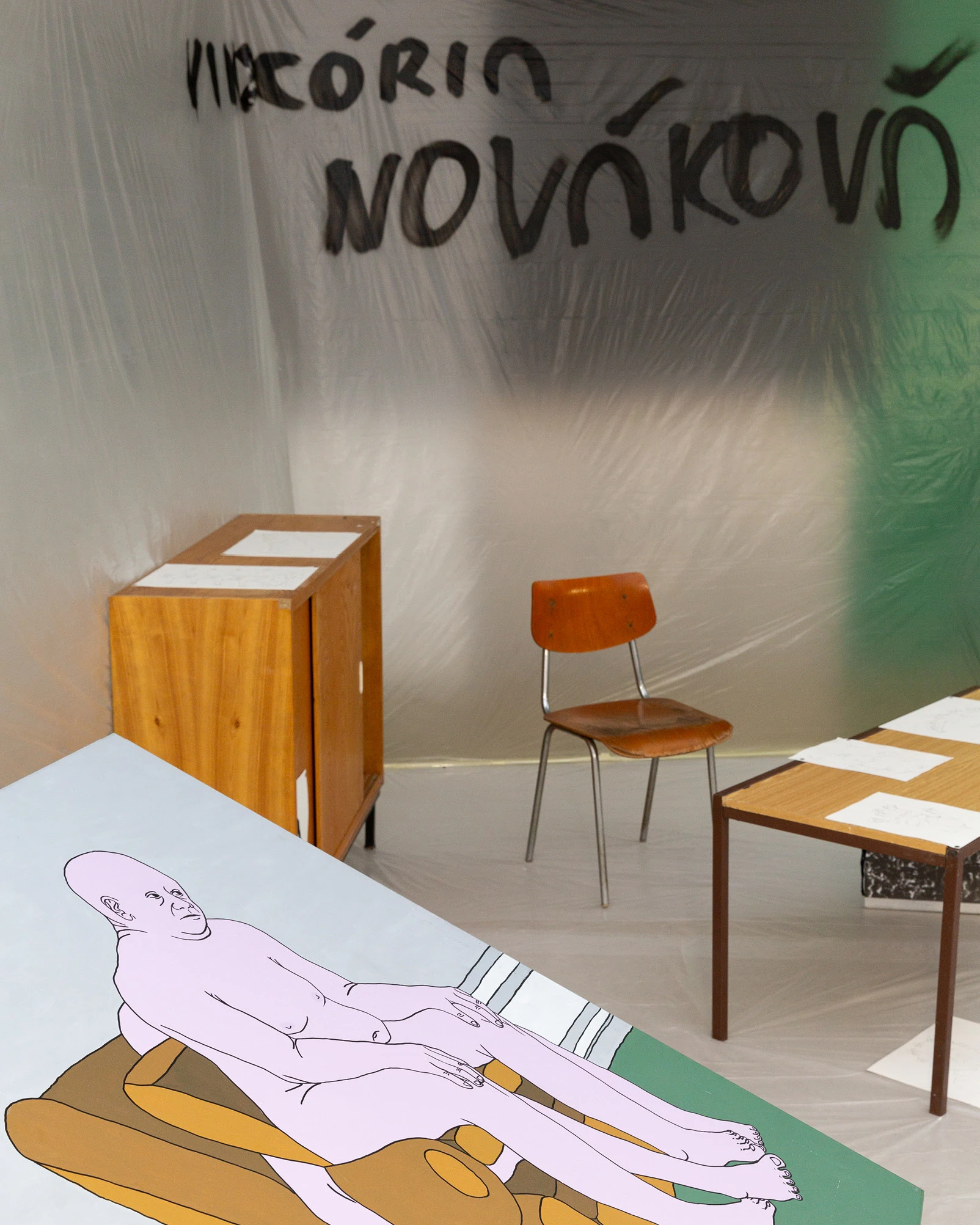 Výstava je komponovaná ako pole obrazov na samostatných drevených konštrukciách z hranolov. Maľby sú radené za sebou v jemne vychýlených líniách, čím vznikajú priehľady a napätie medzi dielami. Ich sklon a rozostavenie evokujú pohyb a ľahkosť, akoby reagovali na prúdenie vzduchu v priestore. Každé dielo má vlastný priestor, no zároveň prirodzene zapadá do celku. Jednoduché materiálové a konštrukčné riešenie necháva vyniknúť samotnej maľbe a vytvára prostredie pre sústredený, individuálny zážitok z inštalácie.