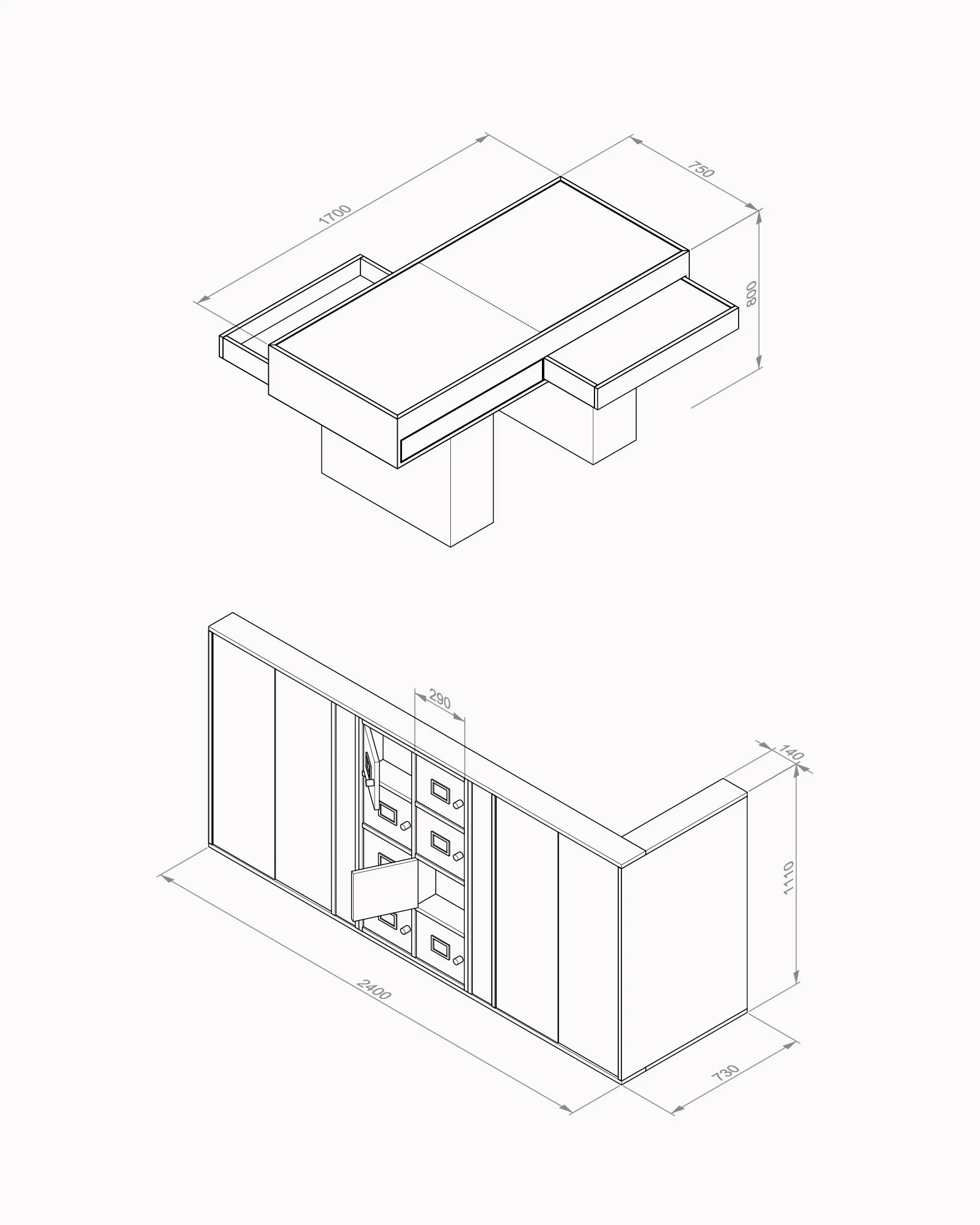 Ústredným objektom je pracovný stôl inšpirovaný ponkom, ktorý prechádza tromi miestnosťami. Vďaka výraznej farbe modrotlače sa stáva nielen výtvarným, ale aj priestorovým ťahákom expozície. Počas prehliadky stôl umožňuje prepnúť sa „zoom in“ od všeobecného k detailnému – zásuvky, vitríny, zvukové stopy, videá, mapping, interaktívne nasvietenie. Funkcia stola pokračuje aj v ďalších priestoroch cez predstenu a úložný systém. Doplnkové zóny ponúknu oddych s tabletmi pre ďalšie informácie ku každému exponátu.
