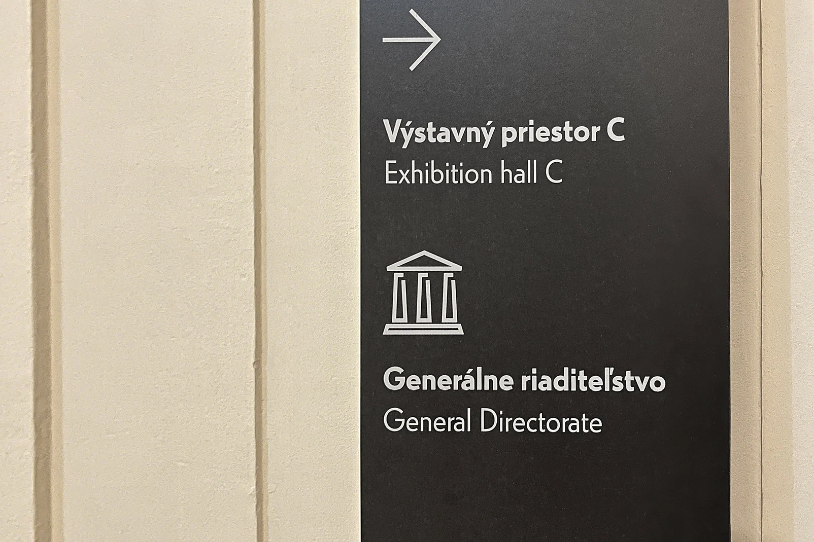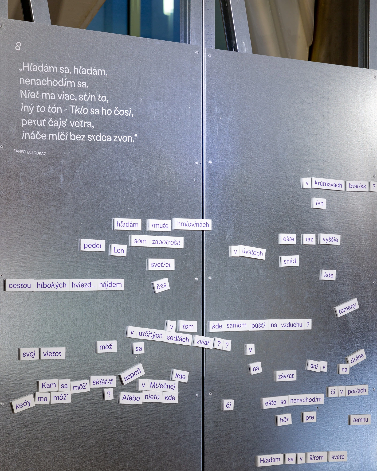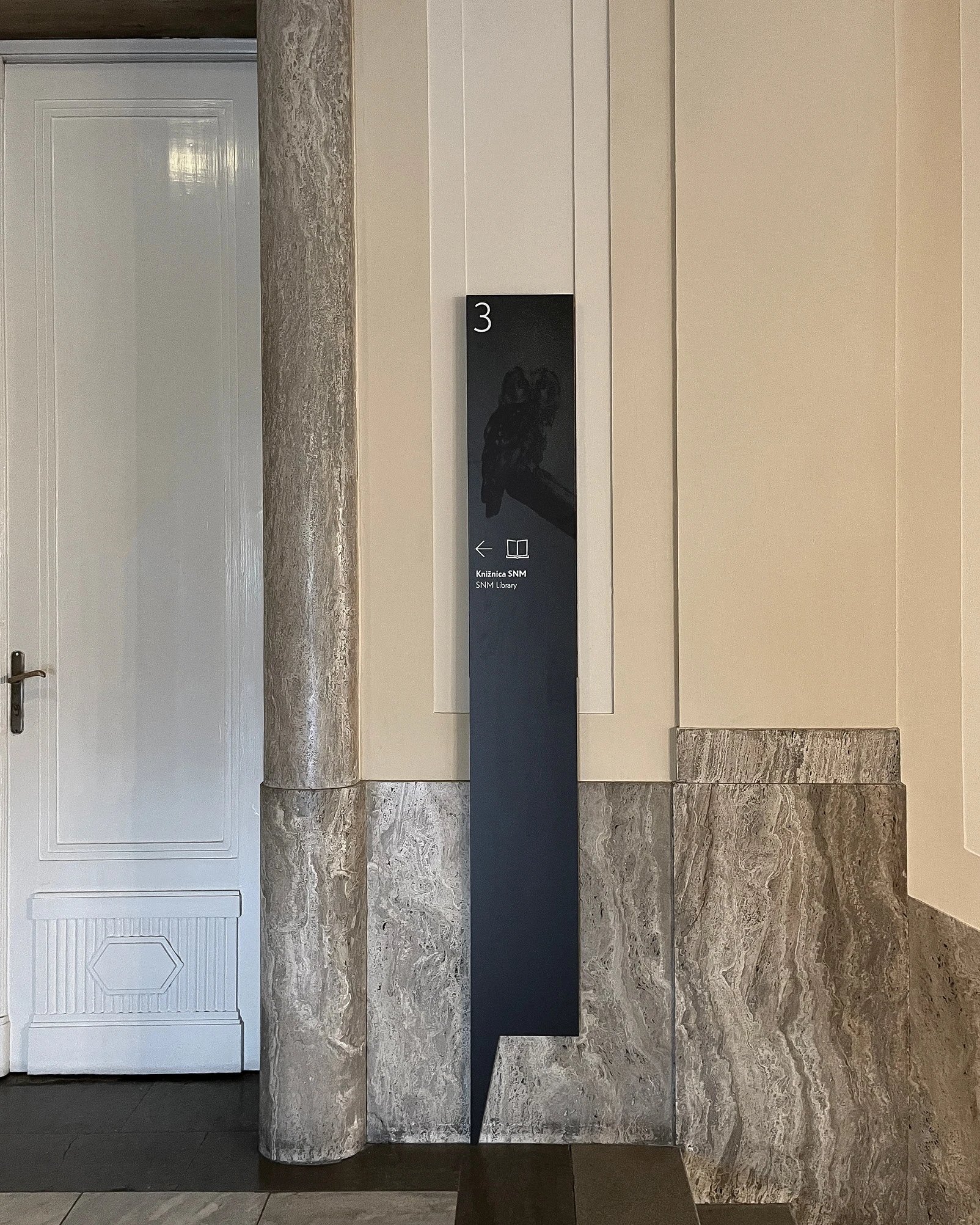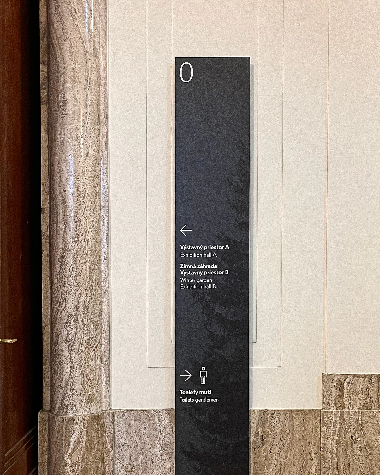 Dizajn informačno navygačného systému kotrý využíva vertikálne panely s grafickými motívmi prírody, čím spája navigáciu s príbehom priestoru.