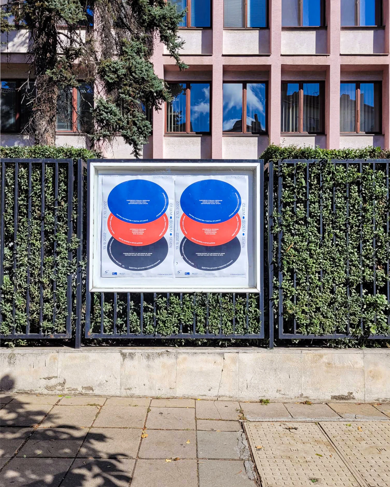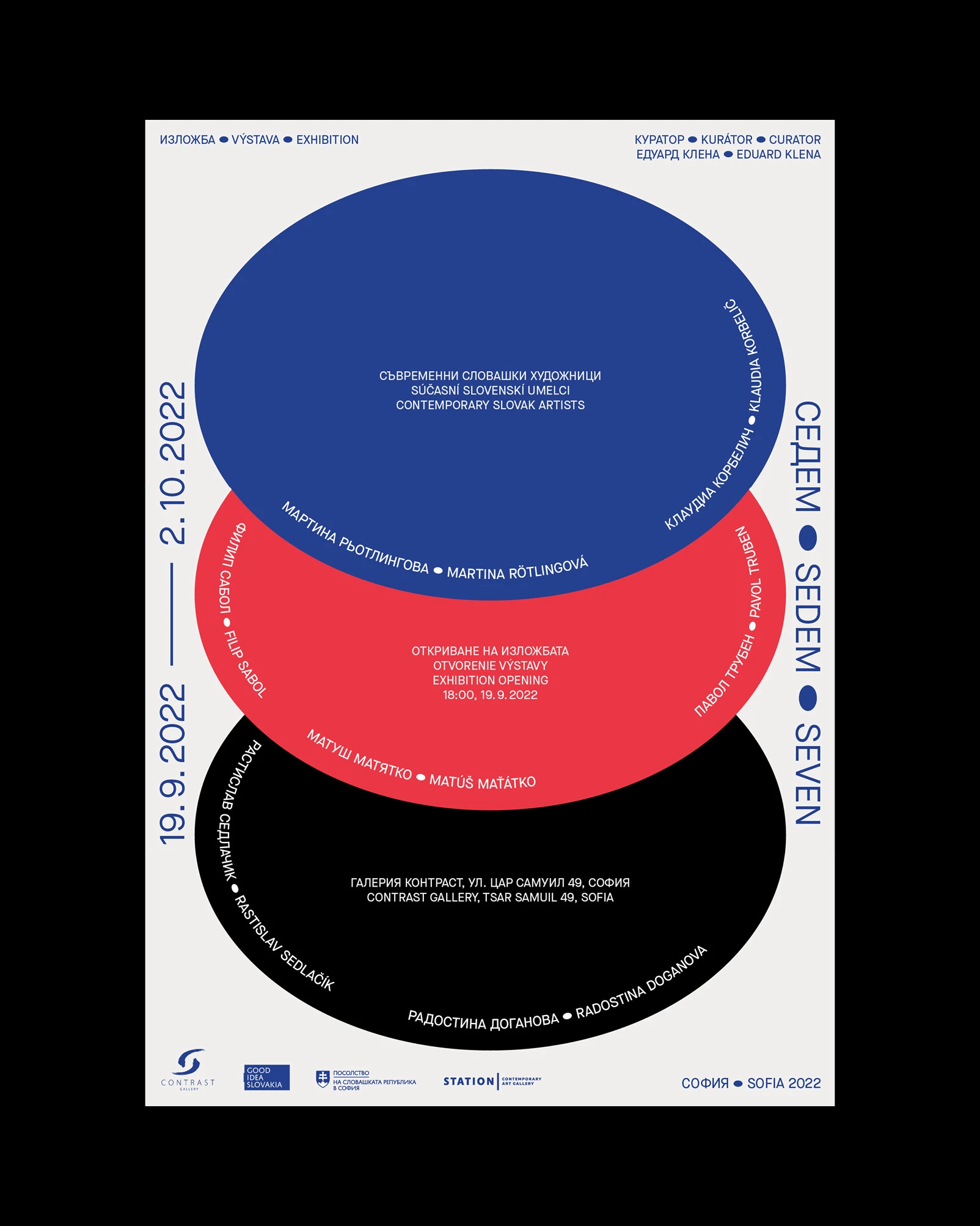 Vizuál výstavy v Sofii propaguje sedem súčasných slovenských umelcov. Grafika využíva prekrývajúce sa elipsy a trikolóru, čím spája Slovensko a Bulharsko a zdôrazňuje medzinárodný charakter.