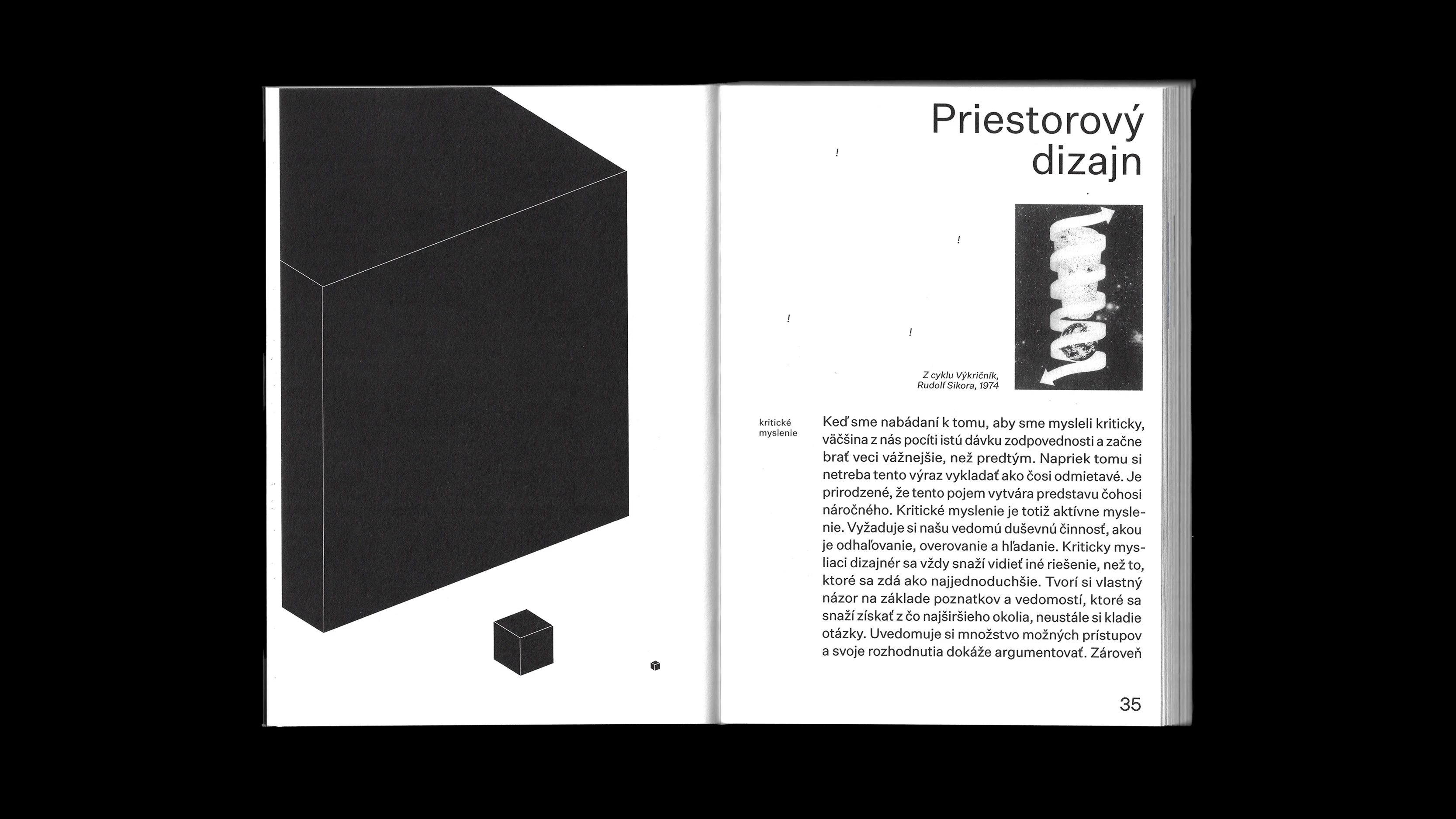 Dizajn publikácie je prispôsobený potrebám študentov ako prenosný, bohato ilustrovaný paperbook. Kombinuje teóriu, históriu a prax v oblasti priestorovej komunikácie. Obálka s rozptýlenými písmenami názvu odkazuje na hviezdnu oblohu ako metaforu poznania, ktoré sa neustále mení. Tak ako hviezda môže zaniknúť ešte skôr, než ju vidíme, aj definície obsiahnuté v knihe majú viesť čitateľa k ich prehodnocovaniu a tvorivému prepísaniu. Layout reflektuje množstvo definícií a konceptov, ktoré publikácia ponúka ako nástroj na ďalšie skúmanie priestoru a jeho vzťahu k vizuálnej komunikácii.