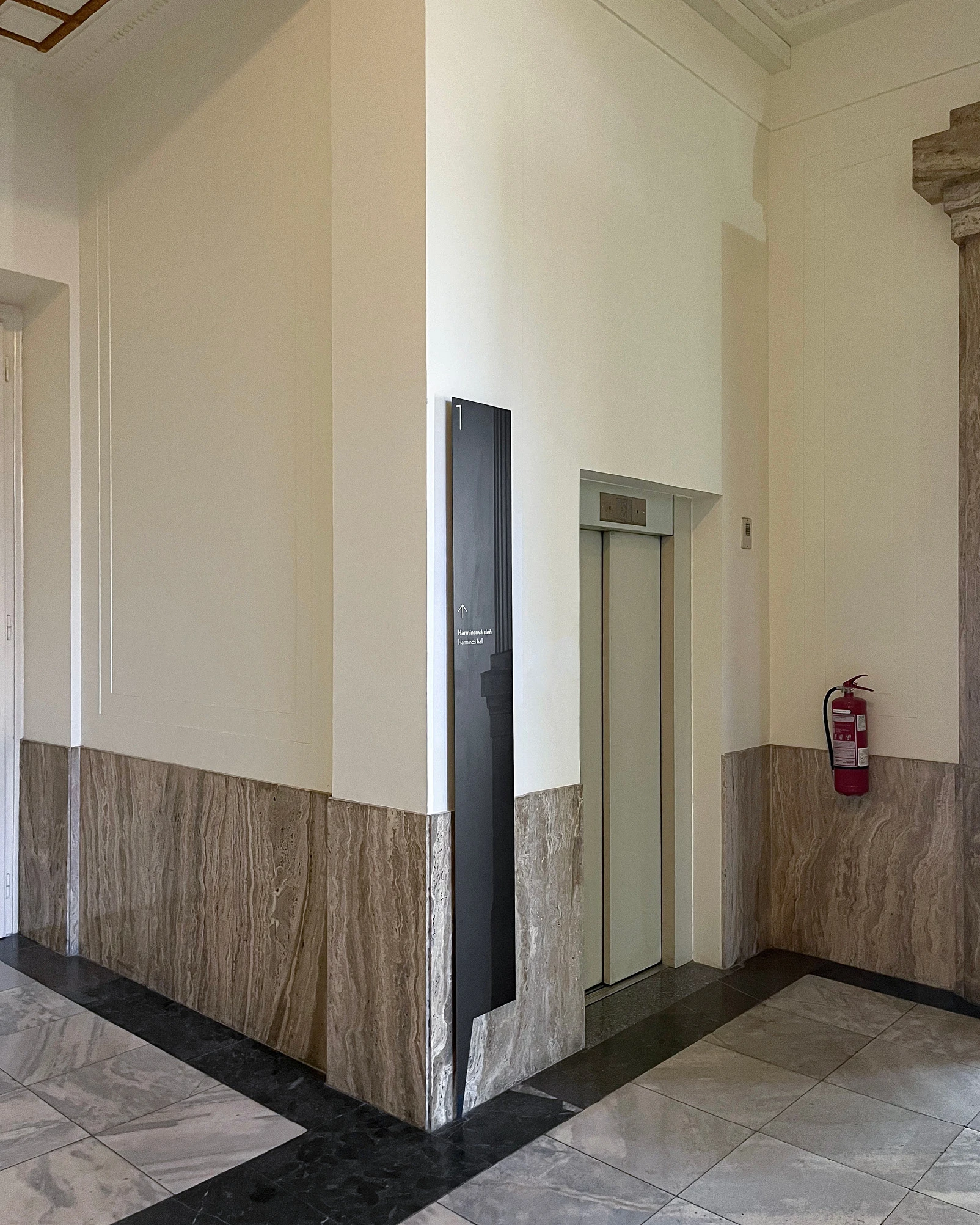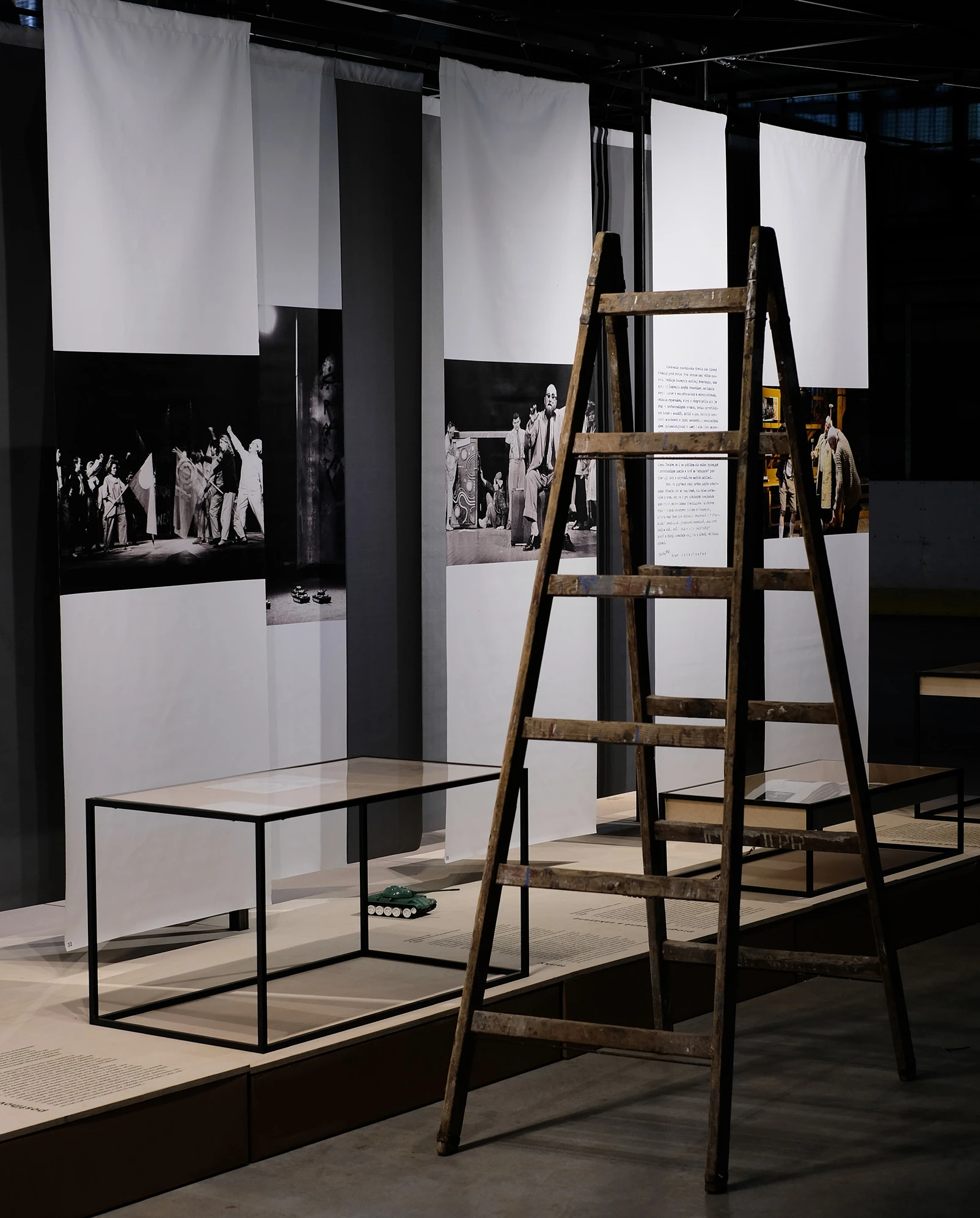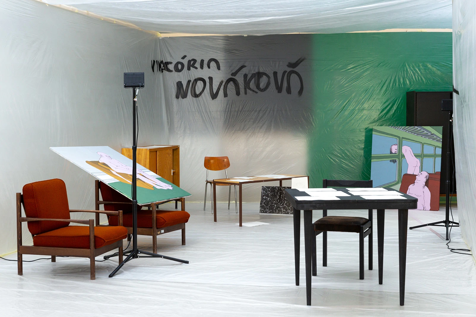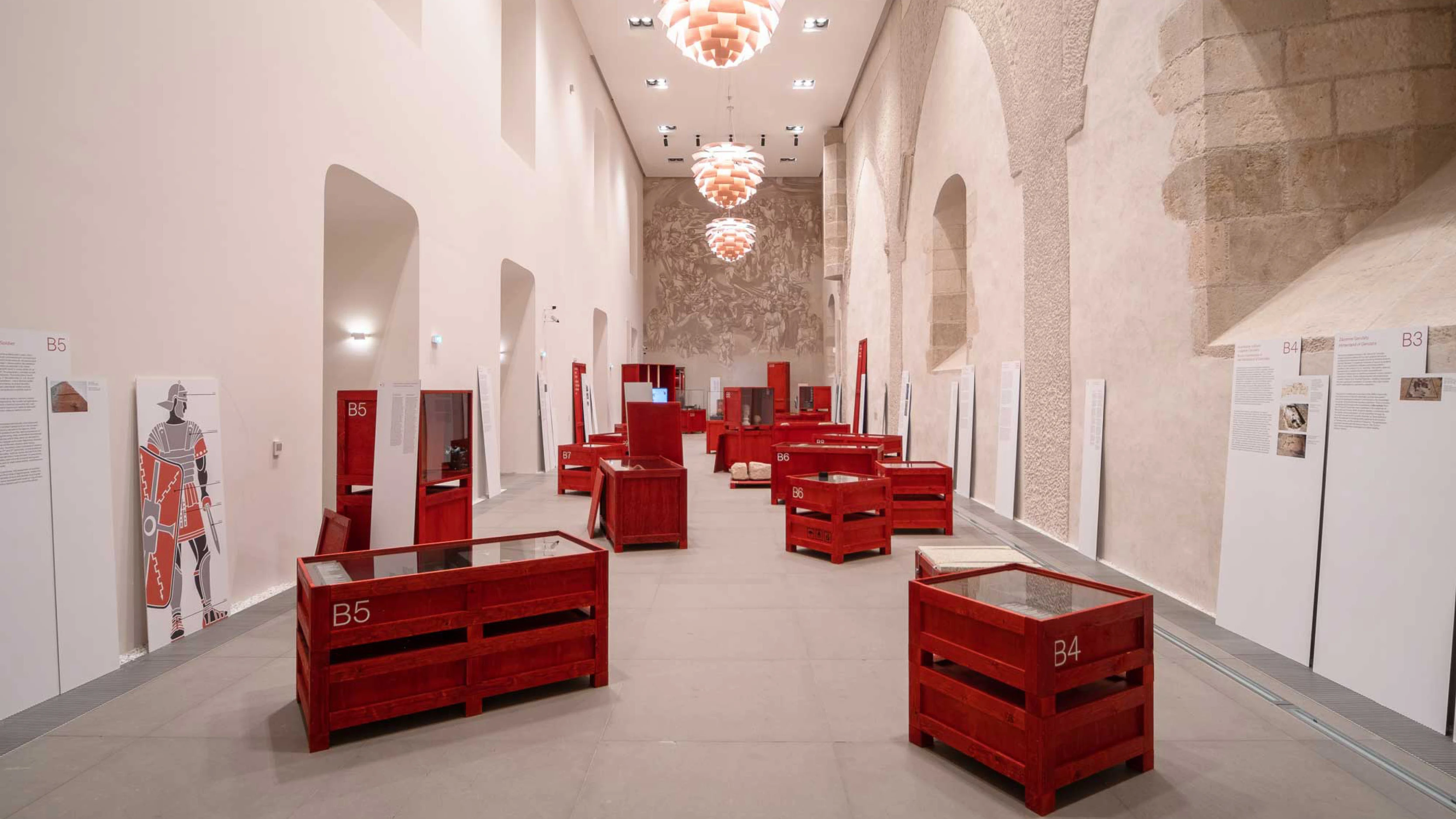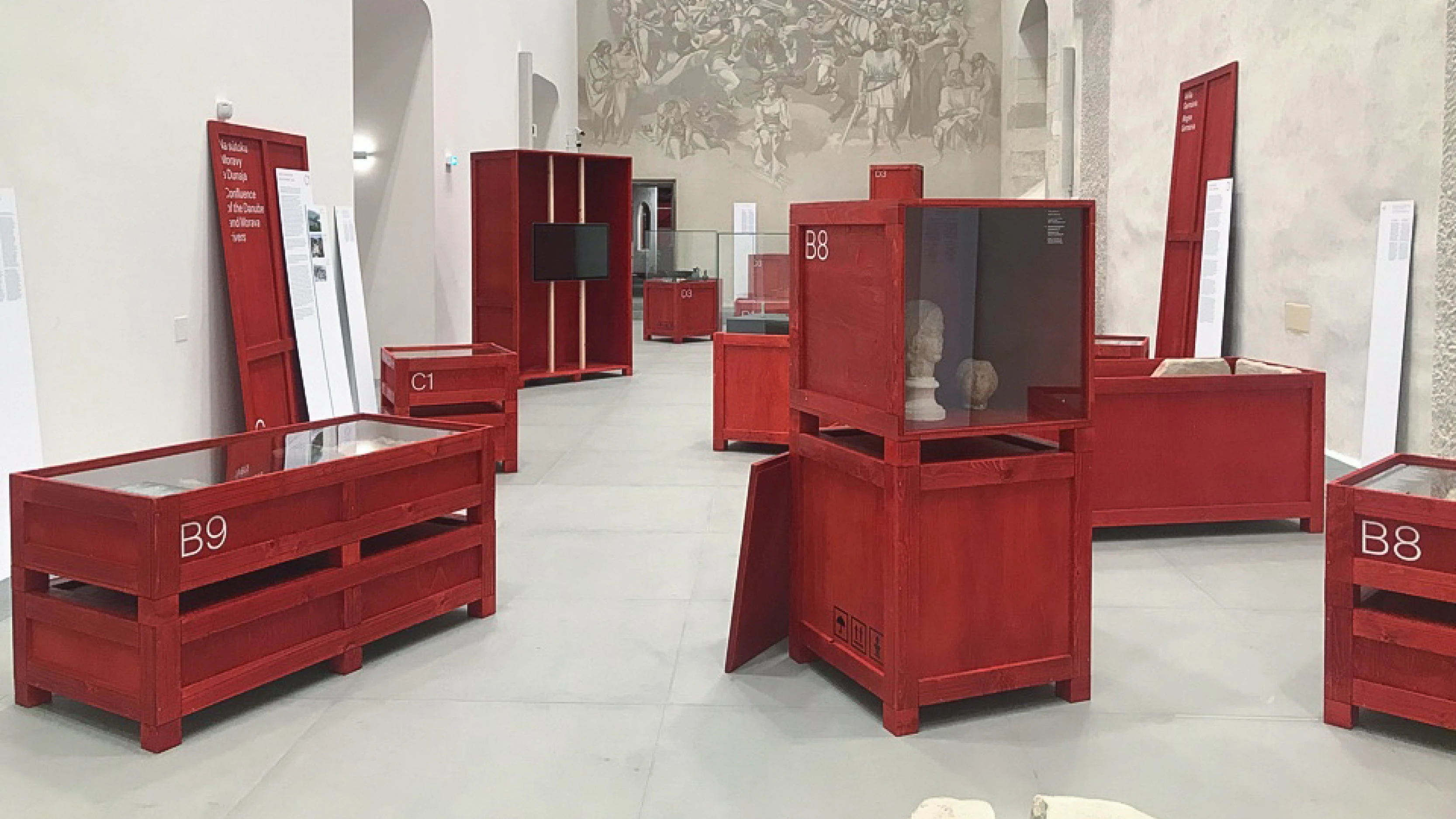 Architektúra výstavy pracuje s motívom transportných debien, ktoré sa po otvorení premieňajú na výstavný mobiliár. Ich robustná konštrukcia, jednotný materiál a sýty odtieň červenej vytvárajú výraznú vizuálnu vrstvu, ktorá kontrastuje s kamennou architektúrou priestoru. Kompozícia pôsobí na prvý pohľad náhodne, no každý objekt má presne určené miesto. Výstavný jazyk tak evokuje dočasnosť, pohyb a neustálu premenu – akoby výstava práve dorazila, otvorila sa a kedykoľvek sa mohla znova zbaliť.