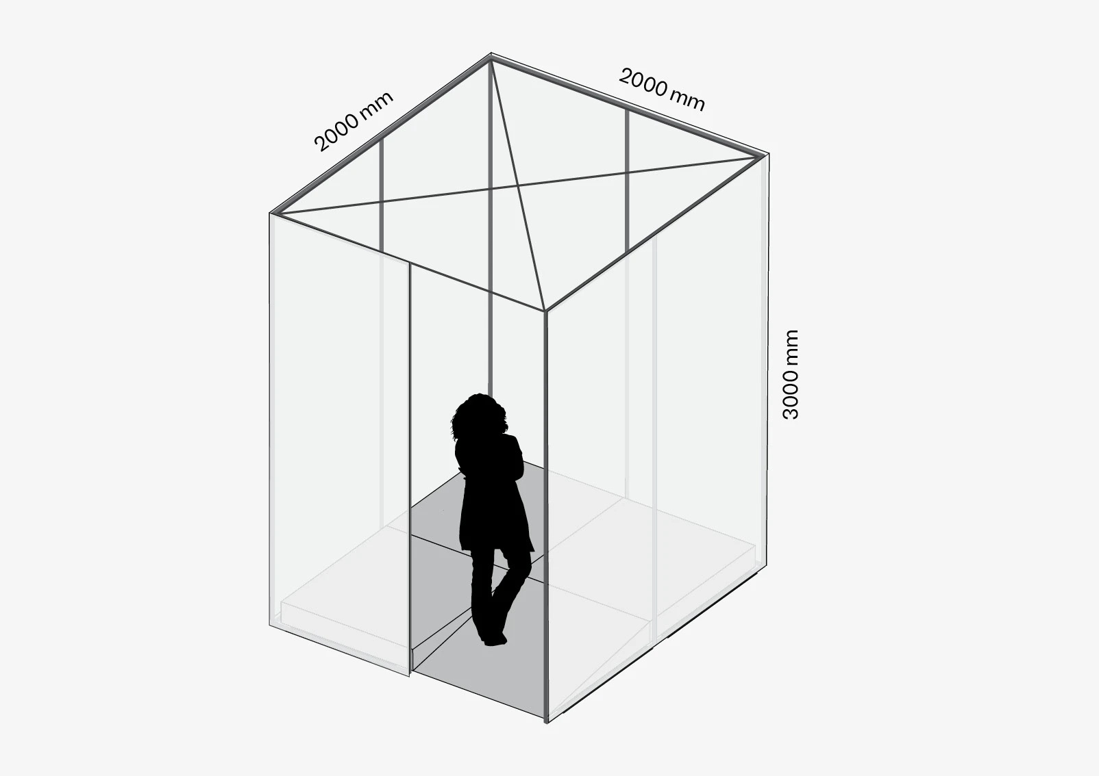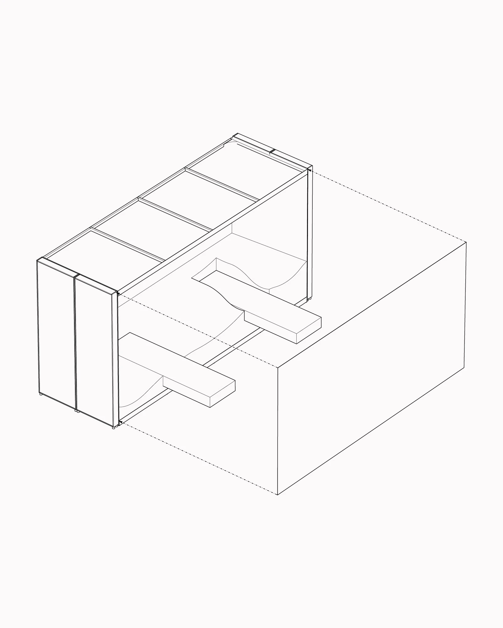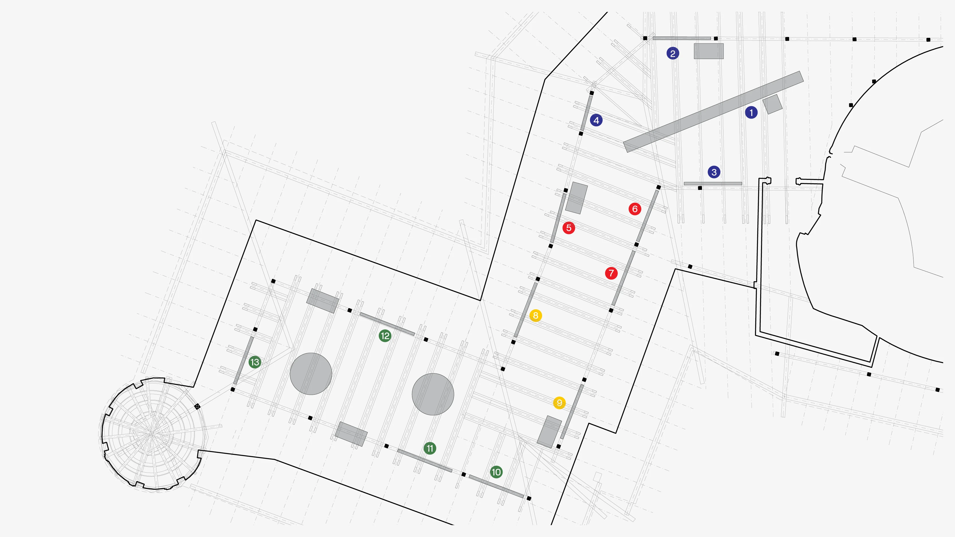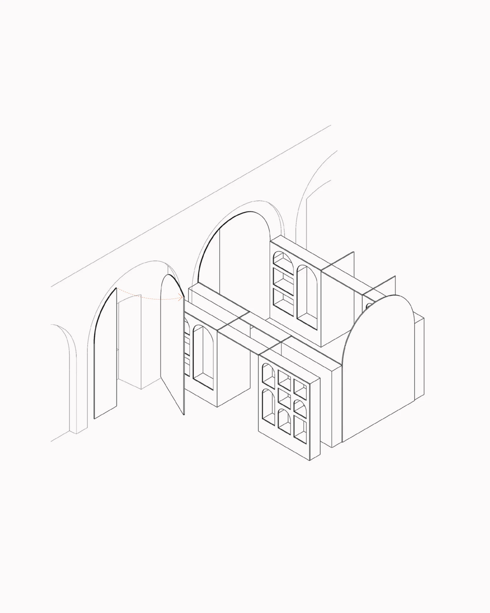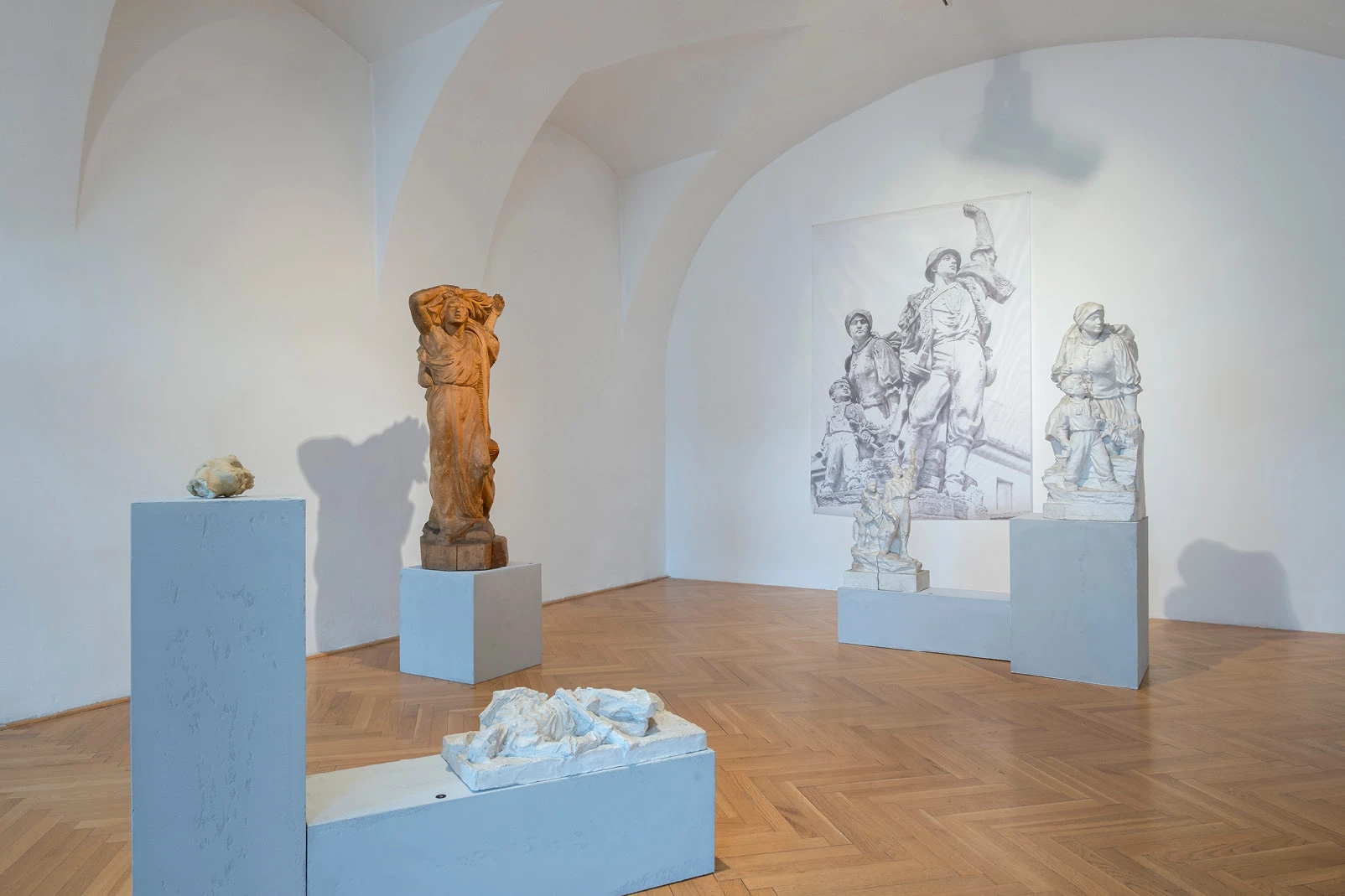 Architektúra výstavy pracuje s motívom transportných debien, ktoré sa po otvorení premieňajú na výstavný mobiliár. Ich robustná konštrukcia, jednotný materiál a sýty odtieň červenej vytvárajú výraznú vizuálnu vrstvu, ktorá kontrastuje s kamennou architektúrou priestoru. Kompozícia pôsobí na prvý pohľad náhodne, no každý objekt má presne určené miesto. Výstavný jazyk tak evokuje dočasnosť, pohyb a neustálu premenu – akoby výstava práve dorazila, otvorila sa a kedykoľvek sa mohla znova zbaliť.
