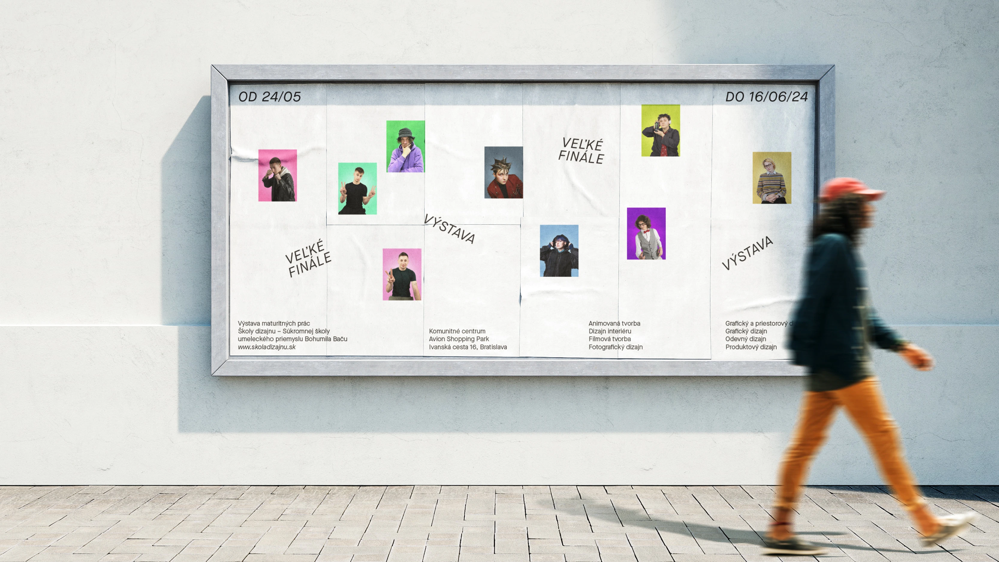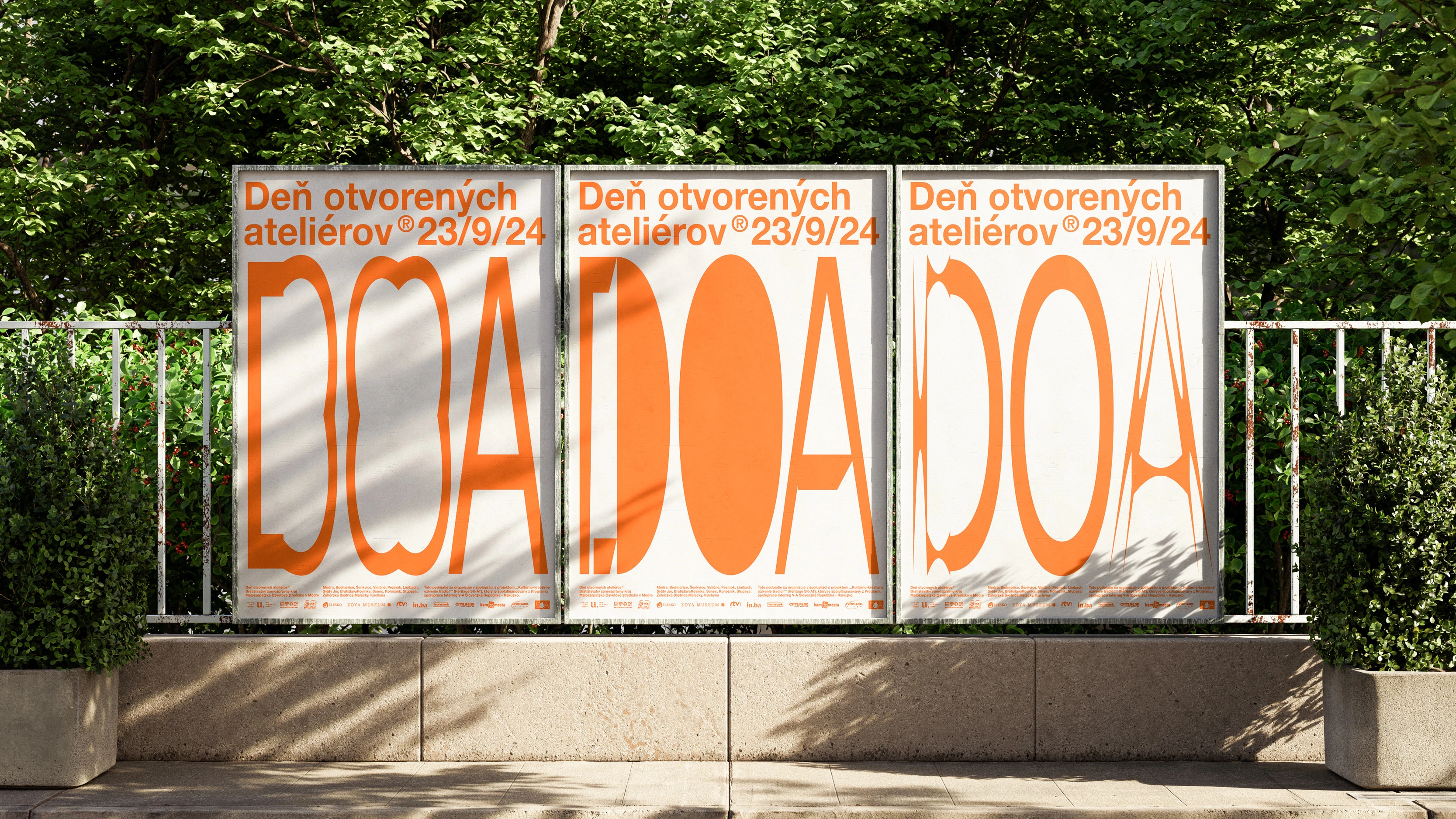 Vizuálna identita Dňa otvorených ateliérov je postavená na variabilnom typografickom systéme založenom na skratke DOA. Modulárne písmo umožňuje široké morfologické transformácie, čím každý plagát nadobúda jedinečný výraz. Typografia sa stáva nositeľom významu aj nálady – komunikuje rôznorodosť, otvorenosť a experimentálny charakter umeleckej scény. Jednofarebné riešenie zjednocuje sériu a vytvára silnú vizuálnu kontinuitu v mestskom prostredí.