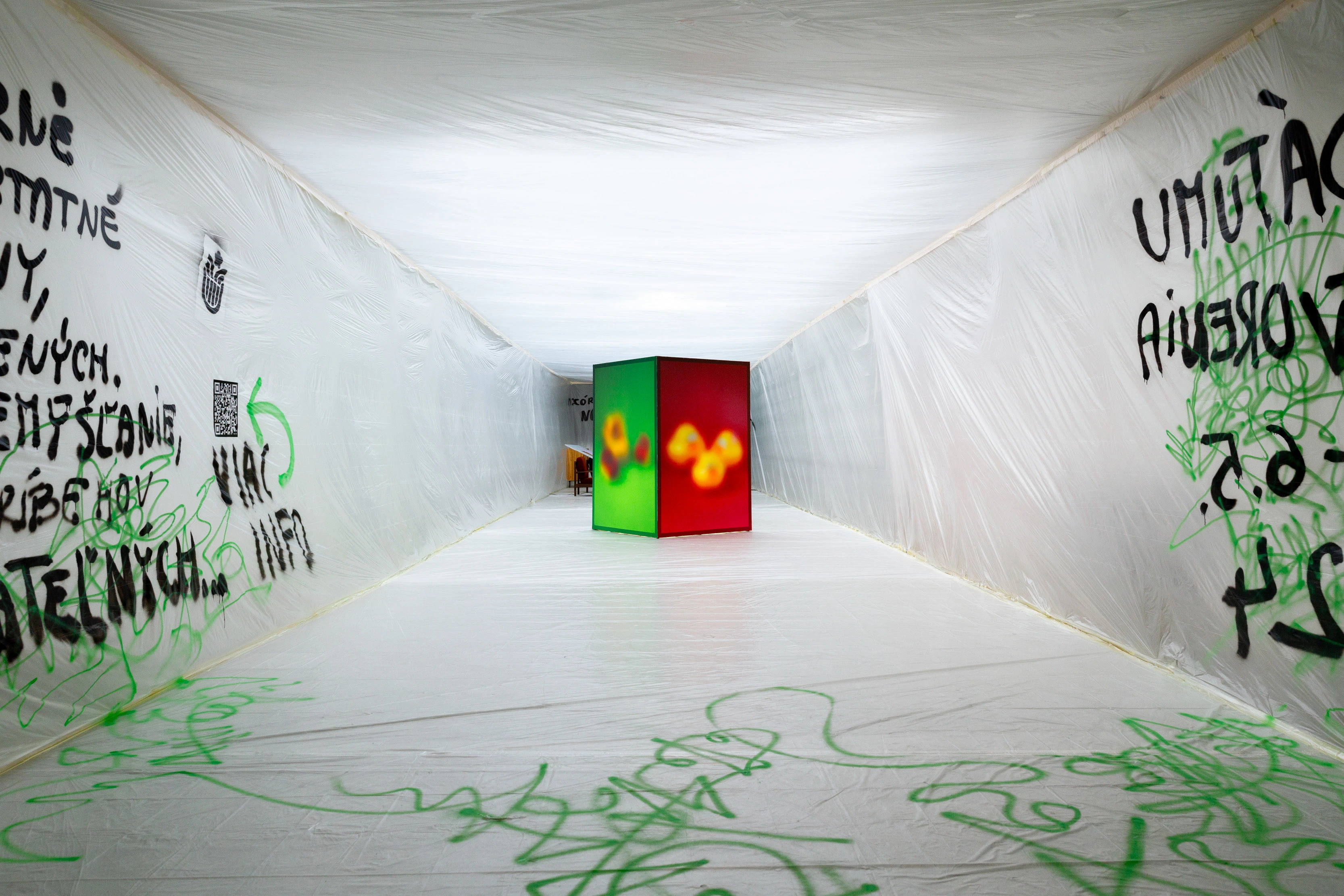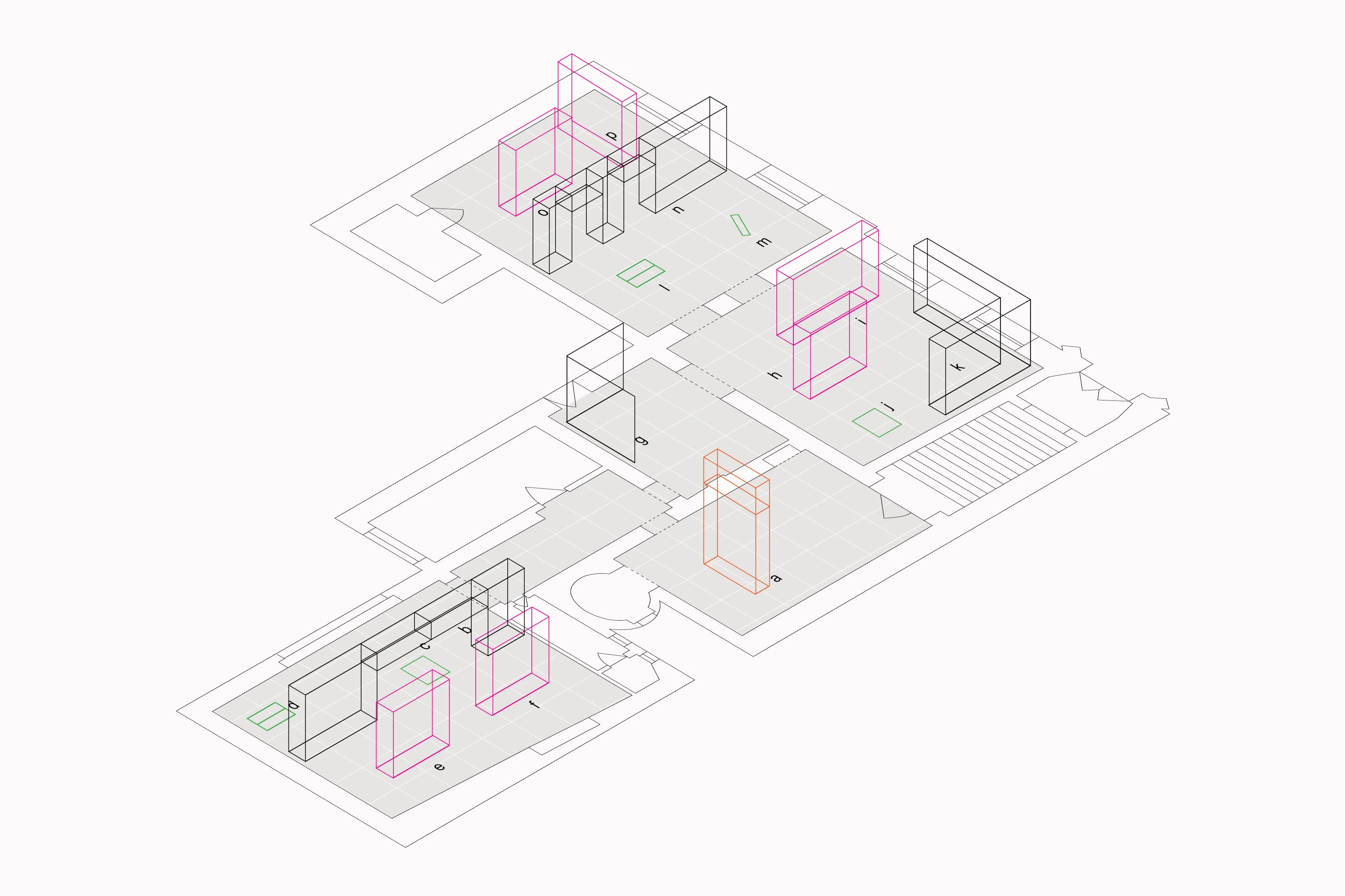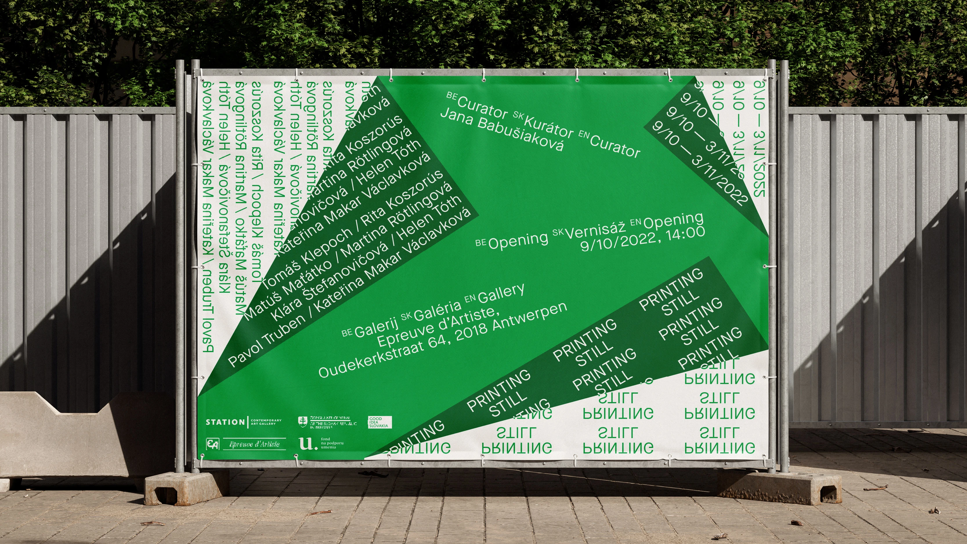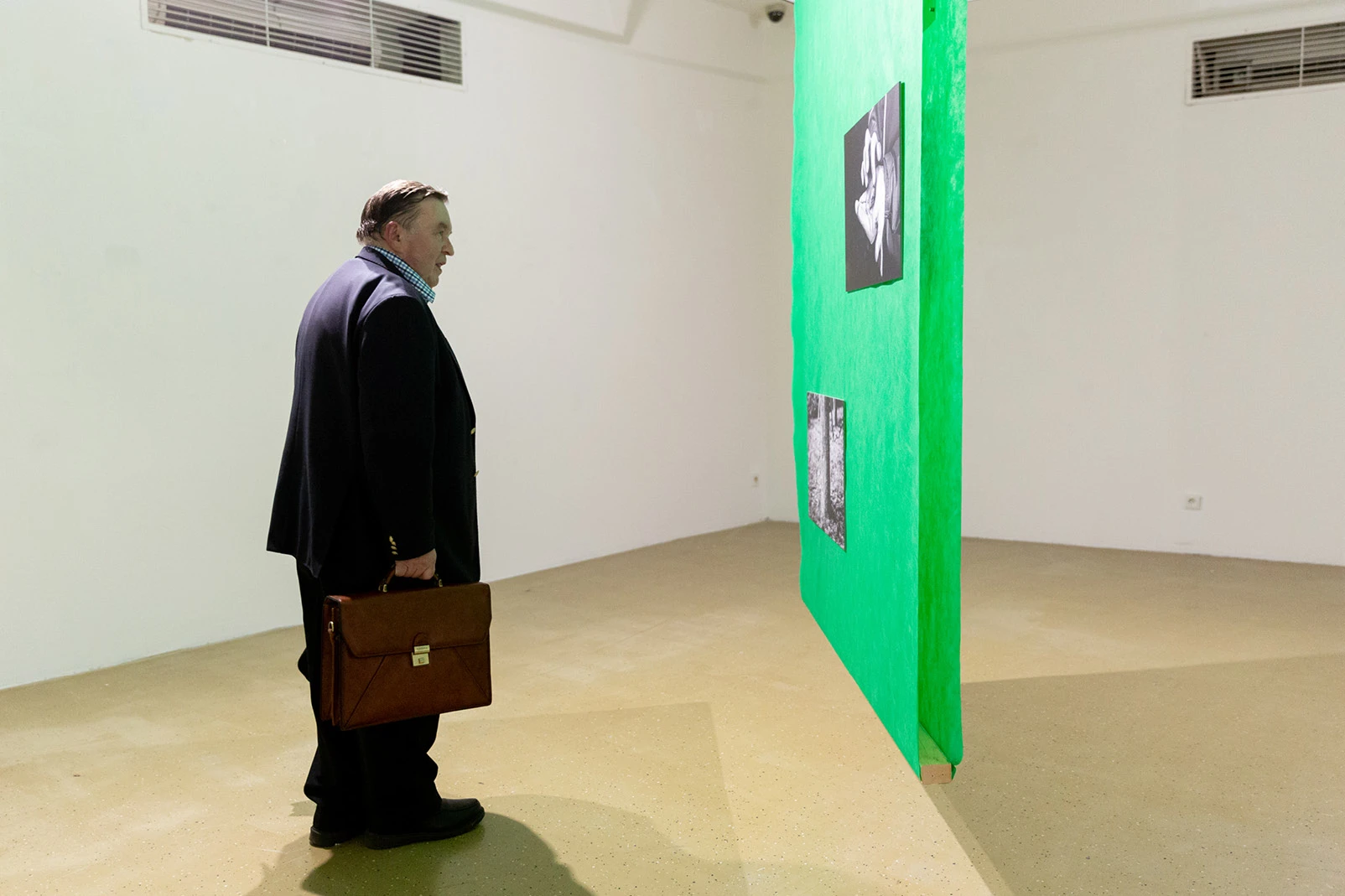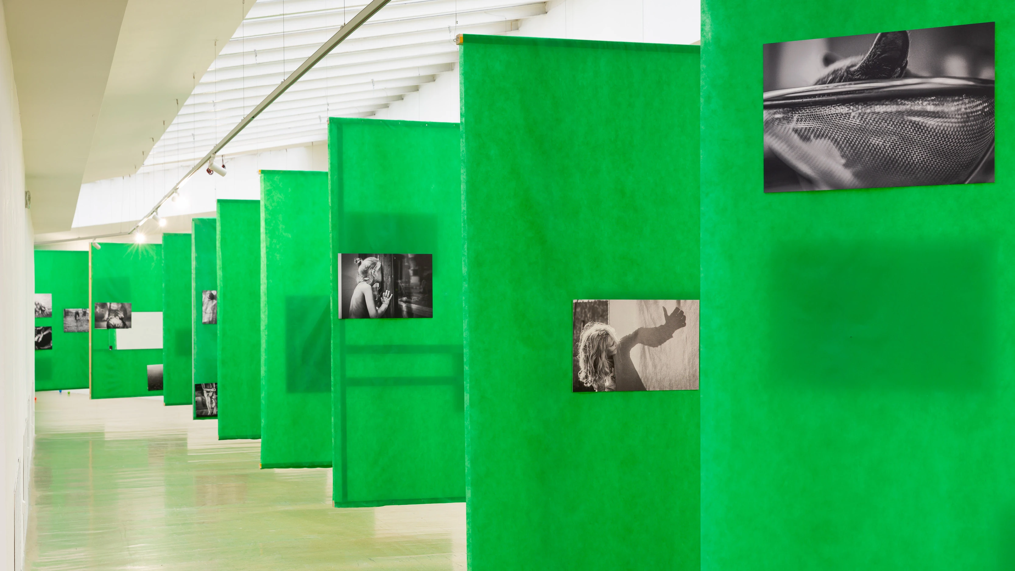 Výstavnú architektúru definuje výrazná zelená farba ktorá sa objavuje v rôznych materiáloch ako povrch stien textilné panely alebo papier a vytvára kontrastné pozadie k prevažne chromatickým dielam. Prvá časť výstavy pracuje s textilnými stenami medzi ktorými sú voľne inštalované objekty zavesené alebo položené. Nasleduje sekcia s radom panelov zoradených za sebou pričom každý ukrýva inú formu prezentácie ako je lupa zrkadlo malý detail alebo veľká fotografia. Posledná časť je definovaná stenou pred ktorou sú predsadené fotografie. Grafika výstavy využíva rovnakú zelenú a pomocou bieleho rastra a šumu vizuálne zjednocuje jednotlivé diela.