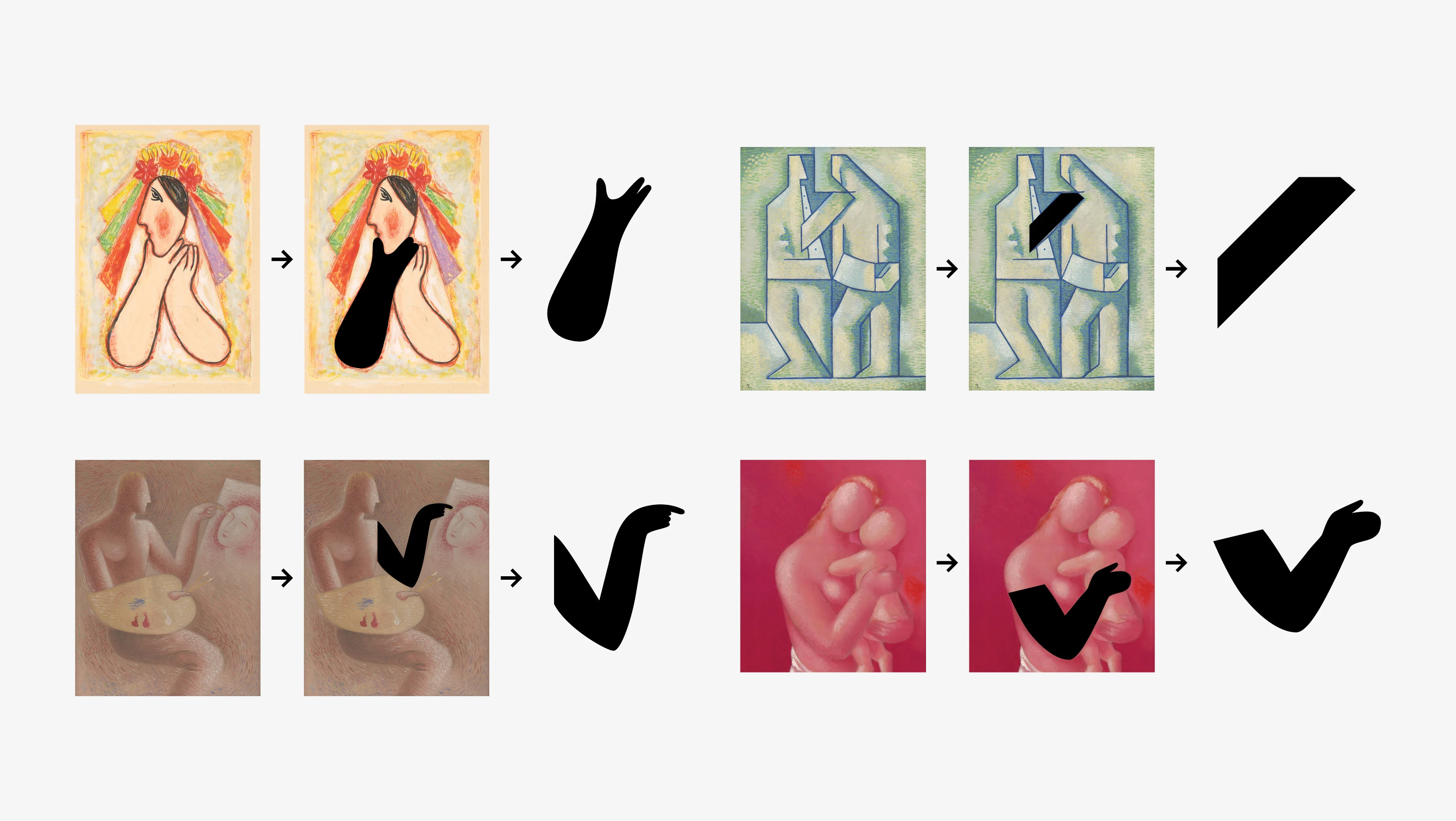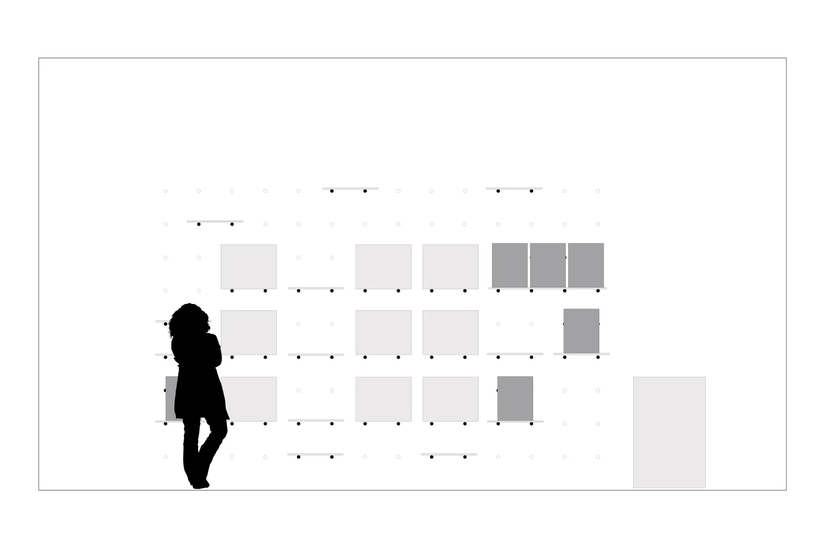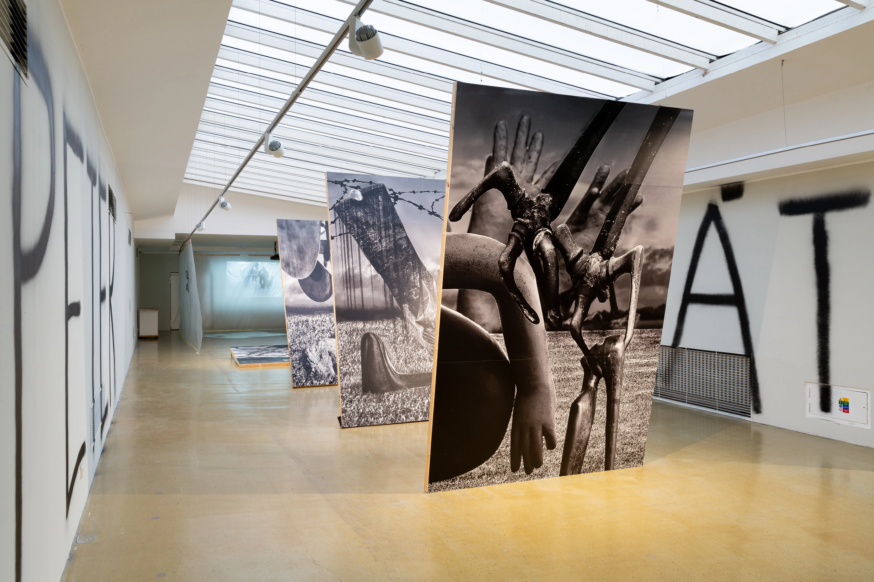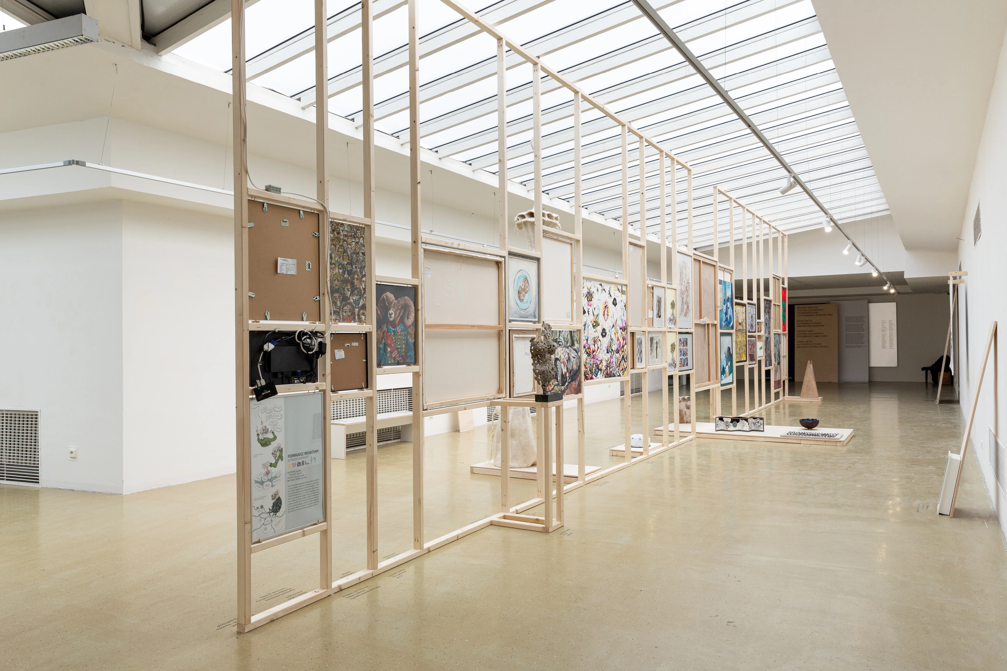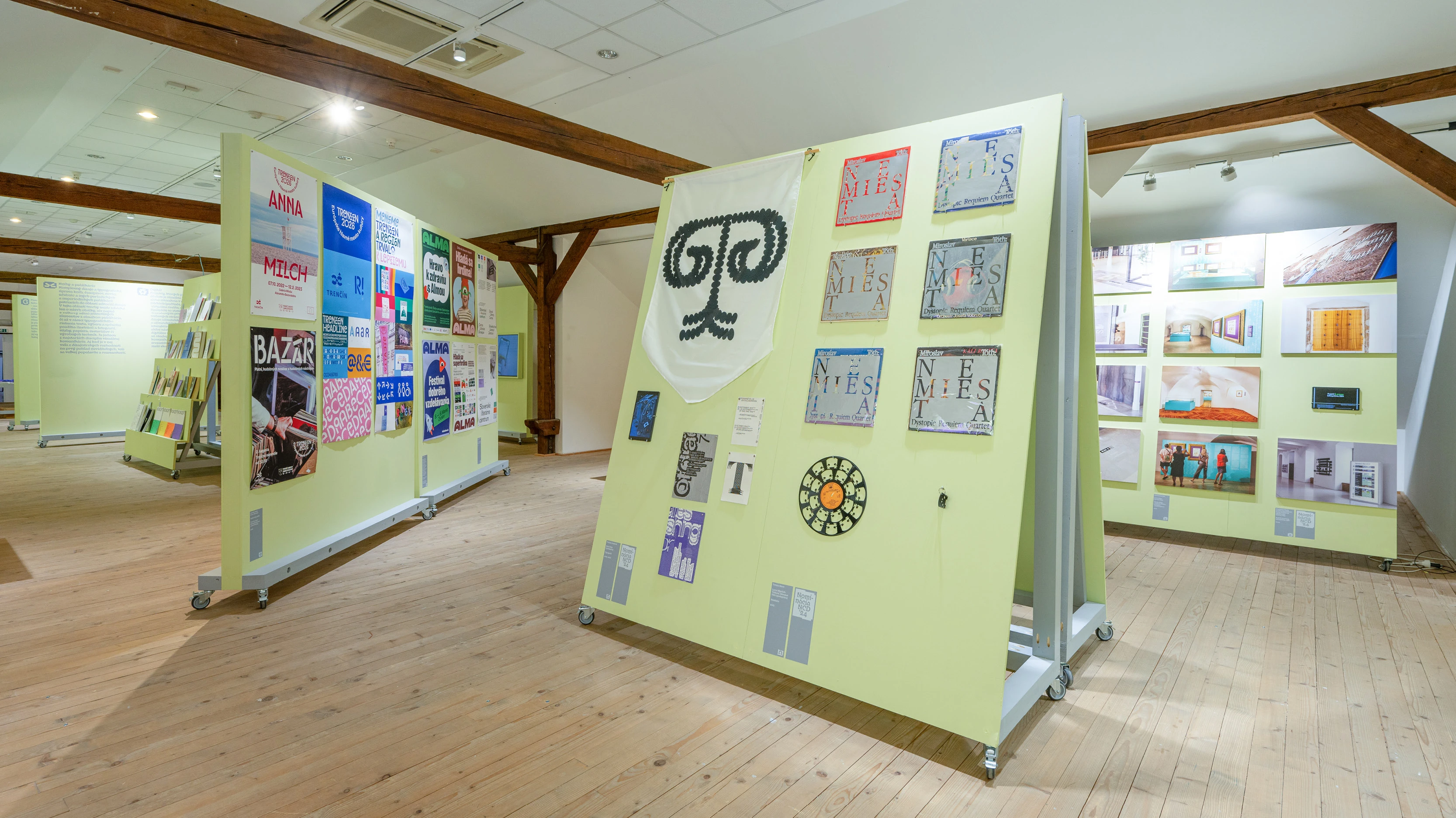 Výstavnú architektúru definuje výrazná zelená farba ktorá sa objavuje v rôznych materiáloch ako povrch stien textilné panely alebo papier a vytvára kontrastné pozadie k prevažne chromatickým dielam. Prvá časť výstavy pracuje s textilnými stenami medzi ktorými sú voľne inštalované objekty zavesené alebo položené. Nasleduje sekcia s radom panelov zoradených za sebou pričom každý ukrýva inú formu prezentácie ako je lupa zrkadlo malý detail alebo veľká fotografia. Posledná časť je definovaná stenou pred ktorou sú predsadené fotografie. Grafika výstavy využíva rovnakú zelenú a pomocou bieleho rastra a šumu vizuálne zjednocuje jednotlivé diela.