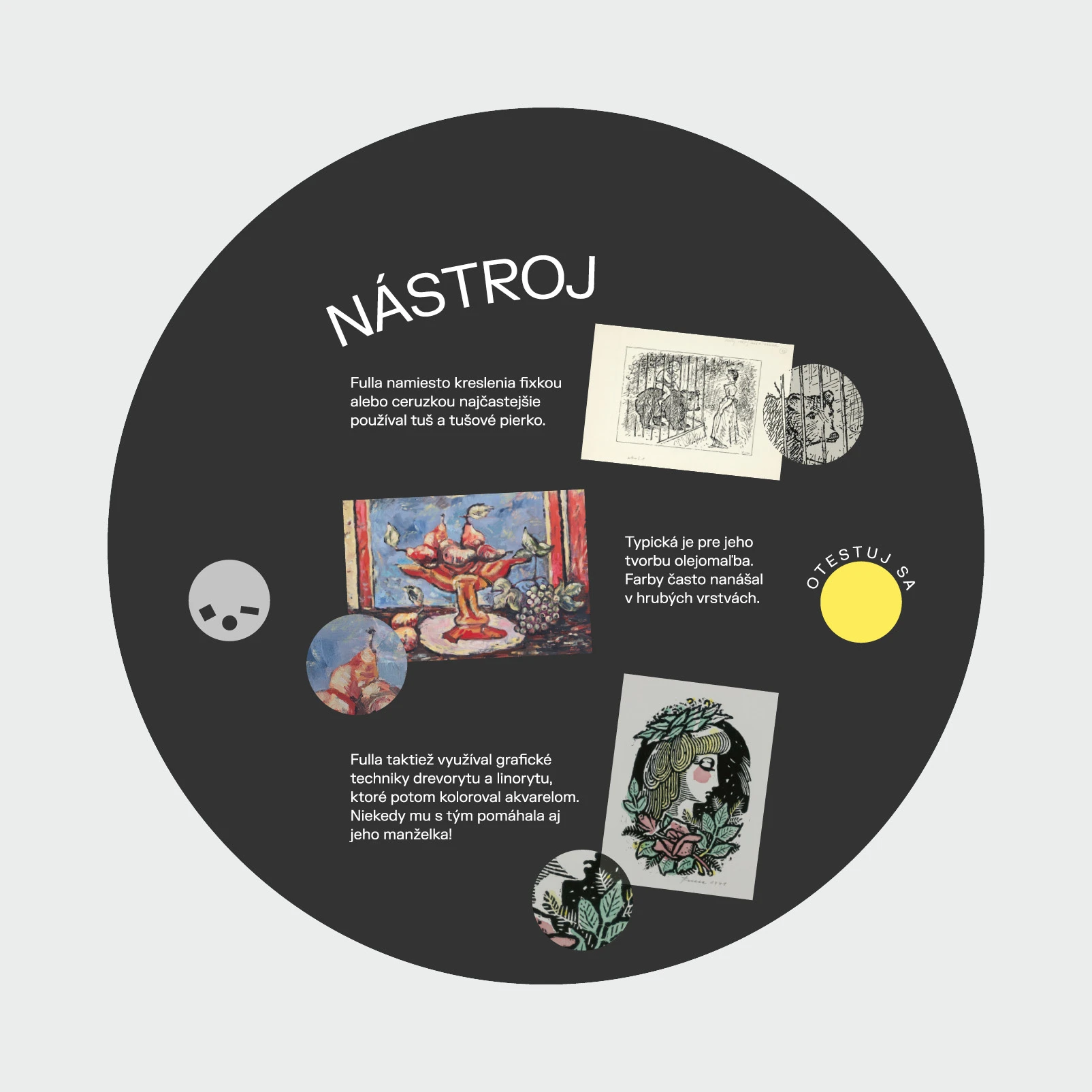Výstava pozostáva z troch tém DOM, DAV a FU GA. DOM odhaľuje Galandovo osobné zázemie spomienky bolesť návraty formovanie jeho prvej grafiky. DAV prezentuje angažovanú tvorbu pre ľavicový časopis vizuálnu kritiku spoločenských pomerov. FU GA predstavuje partnerstvo s Fullom typografiu elementarizmus organickú abstrakciu a poetický vizuálny jazyk.