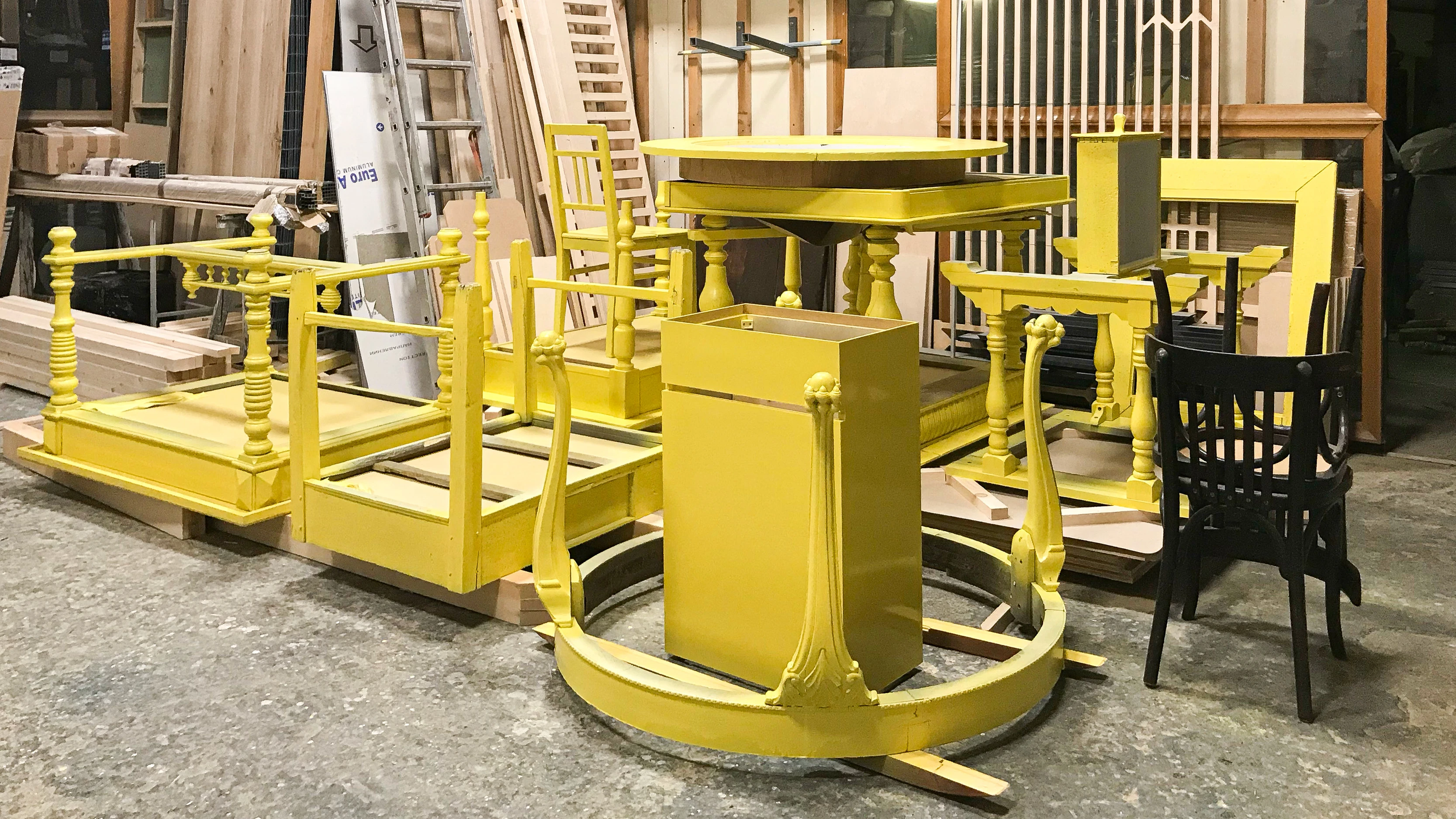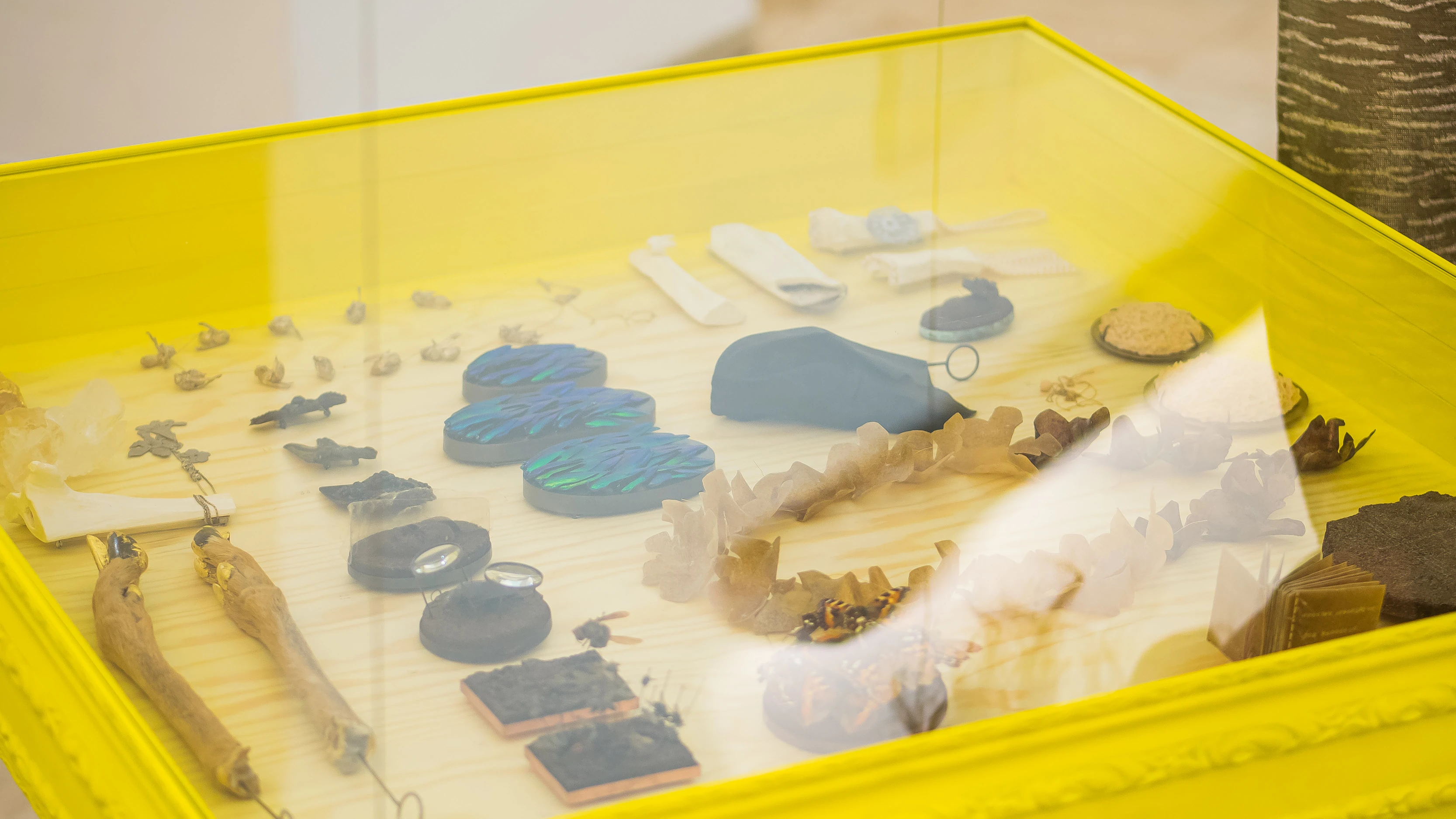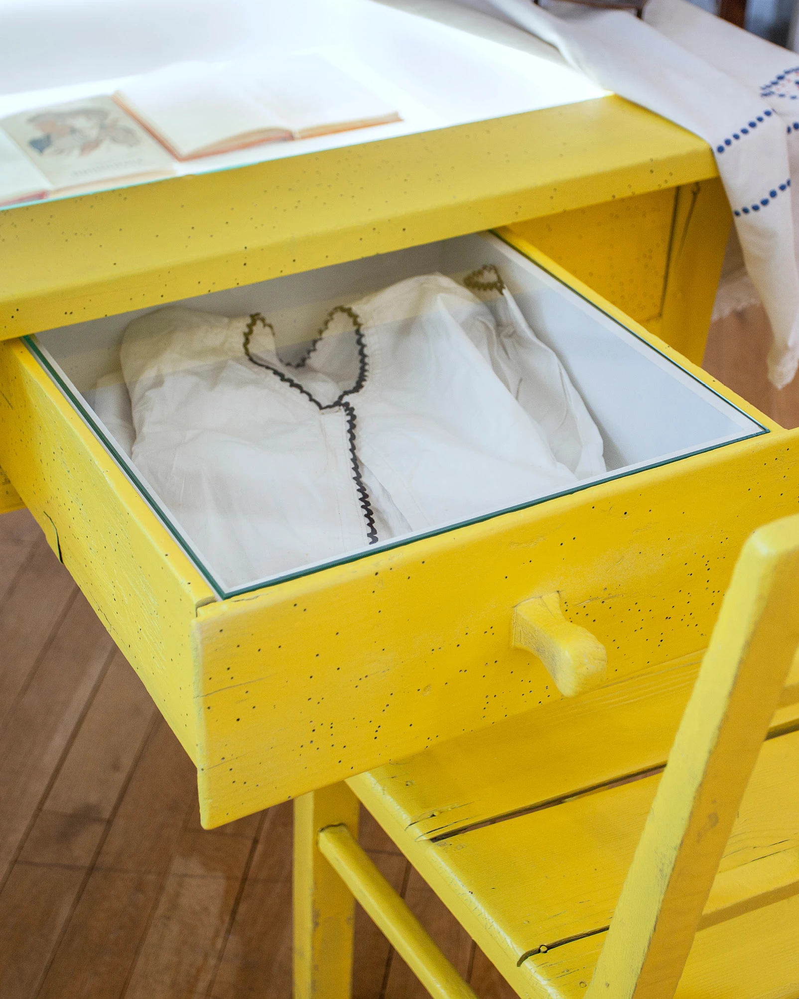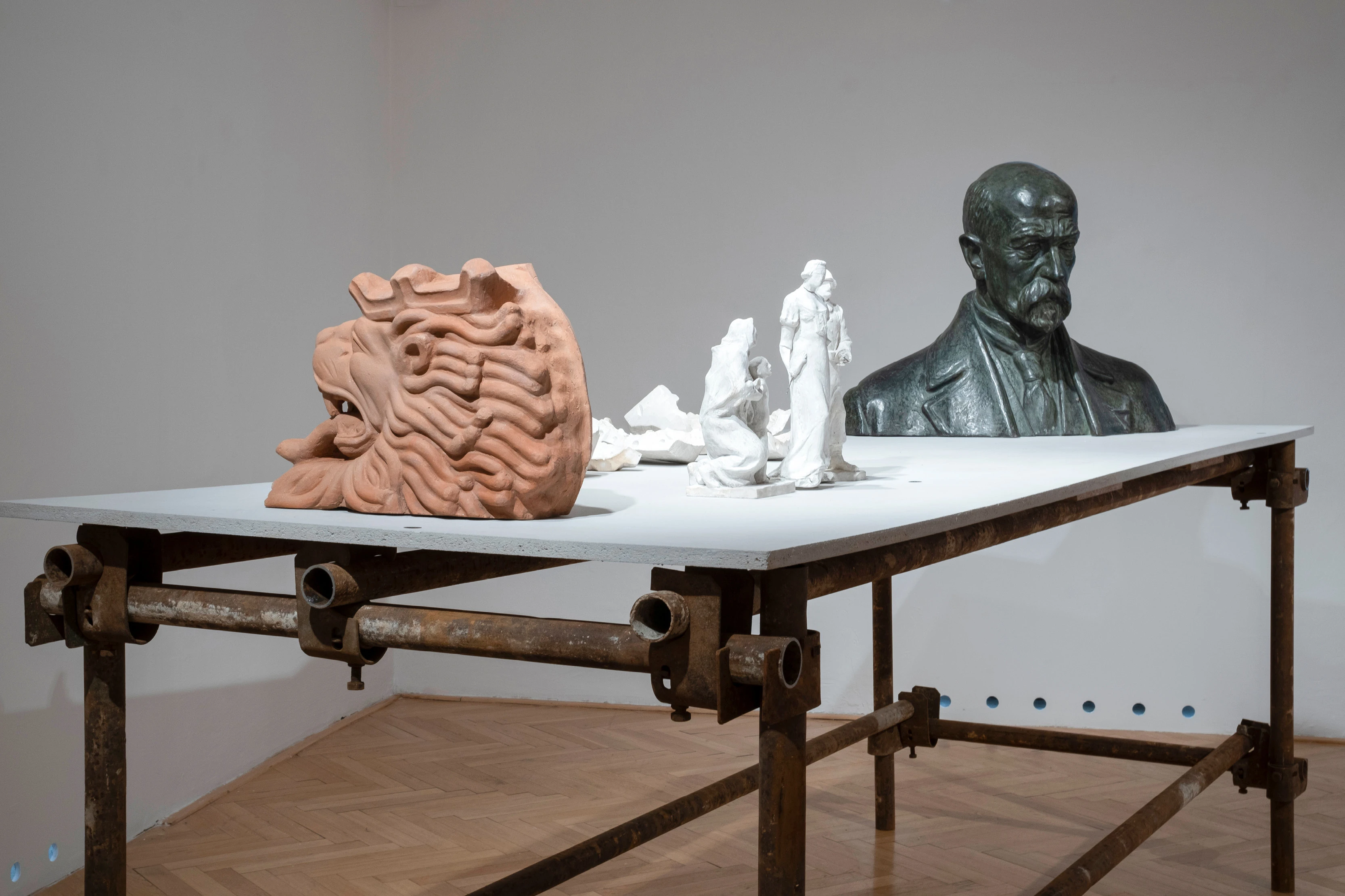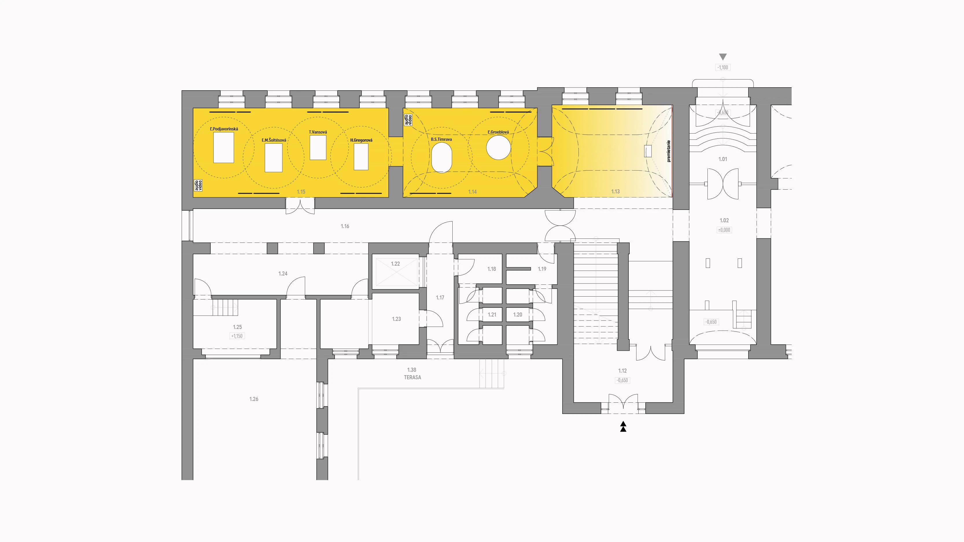 Ústredným objektom je pracovný stôl inšpirovaný ponkom, ktorý prechádza tromi miestnosťami. Vďaka výraznej farbe modrotlače sa stáva nielen výtvarným, ale aj priestorovým ťahákom expozície. Počas prehliadky stôl umožňuje prepnúť sa „zoom in“ od všeobecného k detailnému – zásuvky, vitríny, zvukové stopy, videá, mapping, interaktívne nasvietenie. Funkcia stola pokračuje aj v ďalších priestoroch cez predstenu a úložný systém. Doplnkové zóny ponúknu oddych s tabletmi pre ďalšie informácie ku každému exponátu.