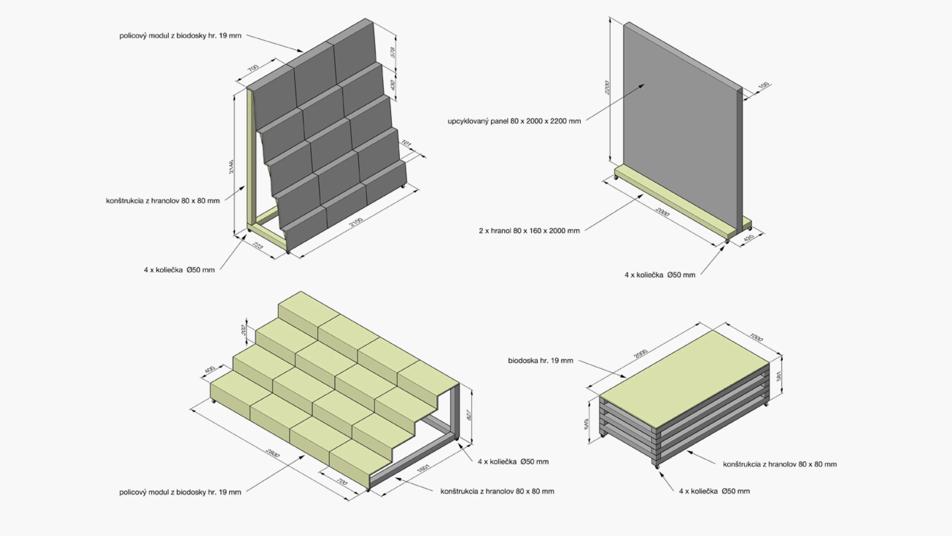 Architektúra a realizácia výstavy v podkrovných priestoroch Slovenského centra dizajnu. Výstava využíva upcyklované prvky expozície, čím vznikol mobilný mobiliár z recyklovaných materiálov, nadväzujúci na vizuálnu identitu.