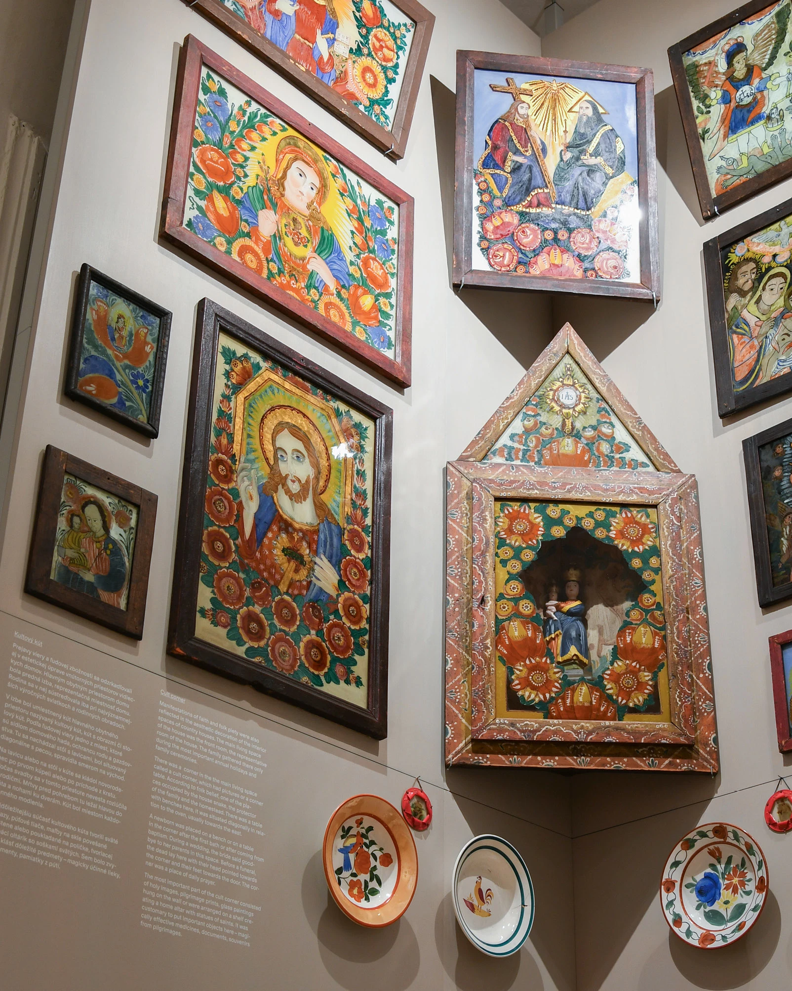 Architektonické riešenie výstavy je založené na vertikálnych paneloch kotvených medzi podlahou a stropom, ktoré svojim tvaroslovím evokujú symbolický vzťah k sakrálnemu priestoru. Panely v neutrálnej sivej farbe nesú potlačenú grafiku a tvoria vizuálne pokojné pozadie pre farebné exponáty. Vystavené kríže sú inštalované na horizontálnych konštrukciách v centre miestností, čím získavajú silný priestorový výraz. Repasované pôvodné vitríny múzea boli doplnené o nové presklenie a policový systém. Celý priestor prešiel rekonštrukciou vrátane výmeny osvetlenia, úprav povrchov a renovácie parkiet. Vizuálna identita výstavy využíva motív ruženca a dobové fotografie, ktoré reflektujú tematické zameranie na duchovný svet vidieckeho obyvateľstva.