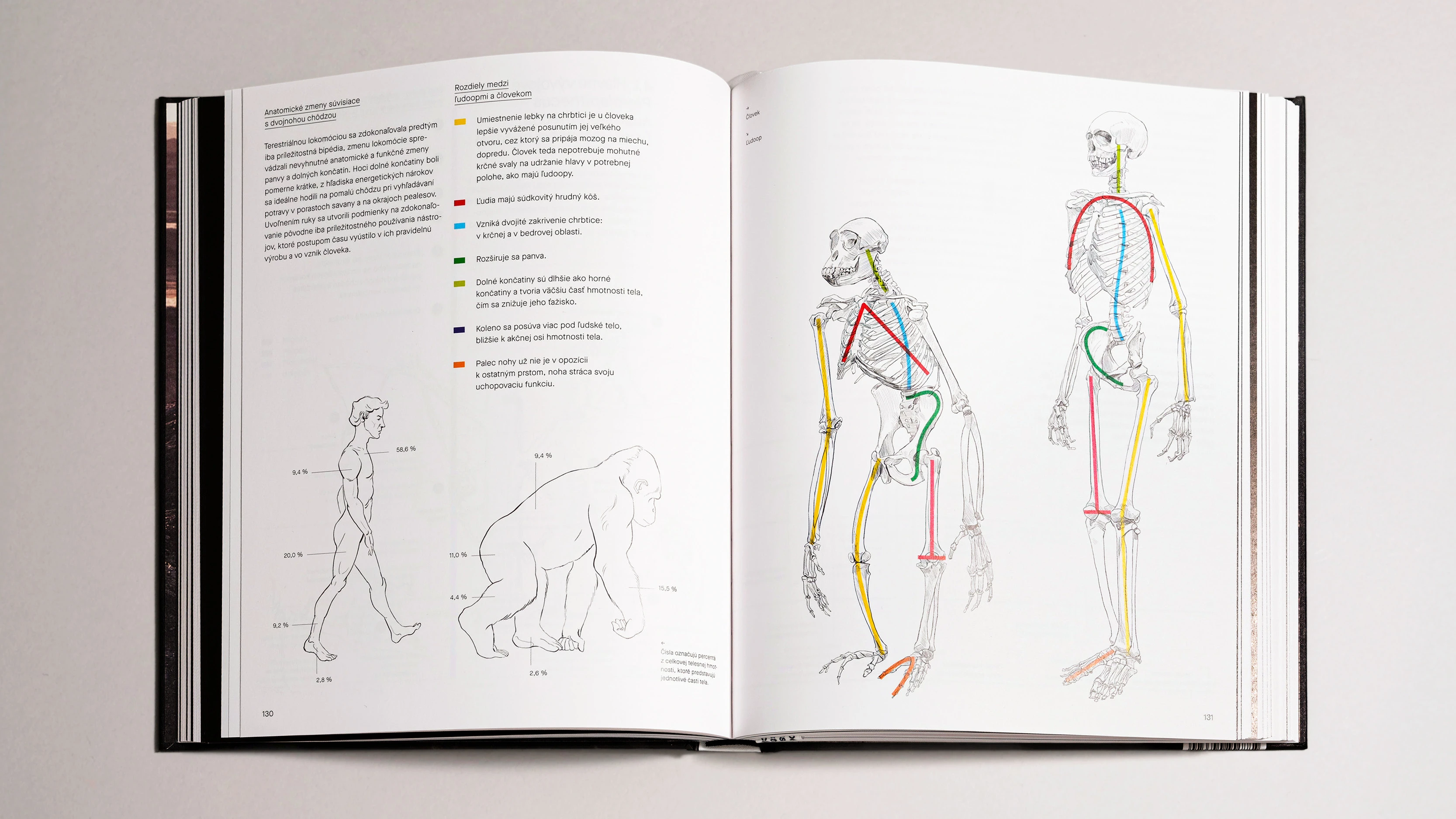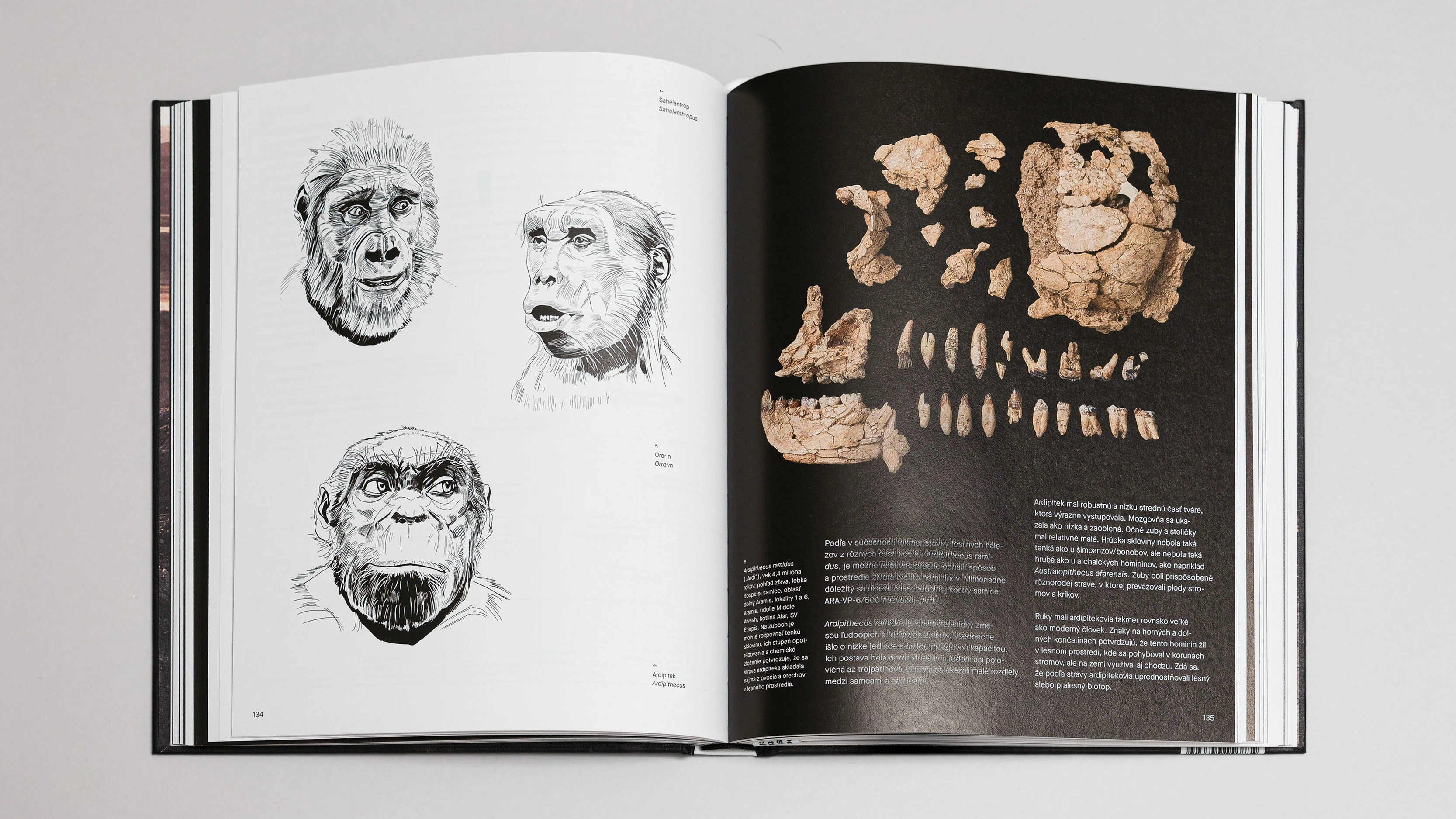 Kniha je transformáciou a rozšírením obsahu expozície “Človek v čase a priestore”, ktorá bola v roku 2022 nominovaná na národnú cenu za dizajn a v roku 2023 na cenu CE ZA AR. Vychádza z vizuálneho charakteru expozície a kombinuje biele plochy (texty, grafy, fotografie) s čiernymi (exponáty). Silnou stránkou expozície je svetlo, ktorého zdrojom sú samotné výstavné panely. Obálka knihy odkazuje na prácu so svetlom tým, že je potlačená UV lakom, ktorý v tme svieti. Obsah publikácie je veľmi rozmanitý – obsahuje texty, schémy, ilustrácie a rôznorodé fotografie. Layout je navrhnutý tak, aby publikácia pôsobila čo najviac vzdušne a nepreberala estetiku klasickej múzejnej, vedeckej encyklopédie.