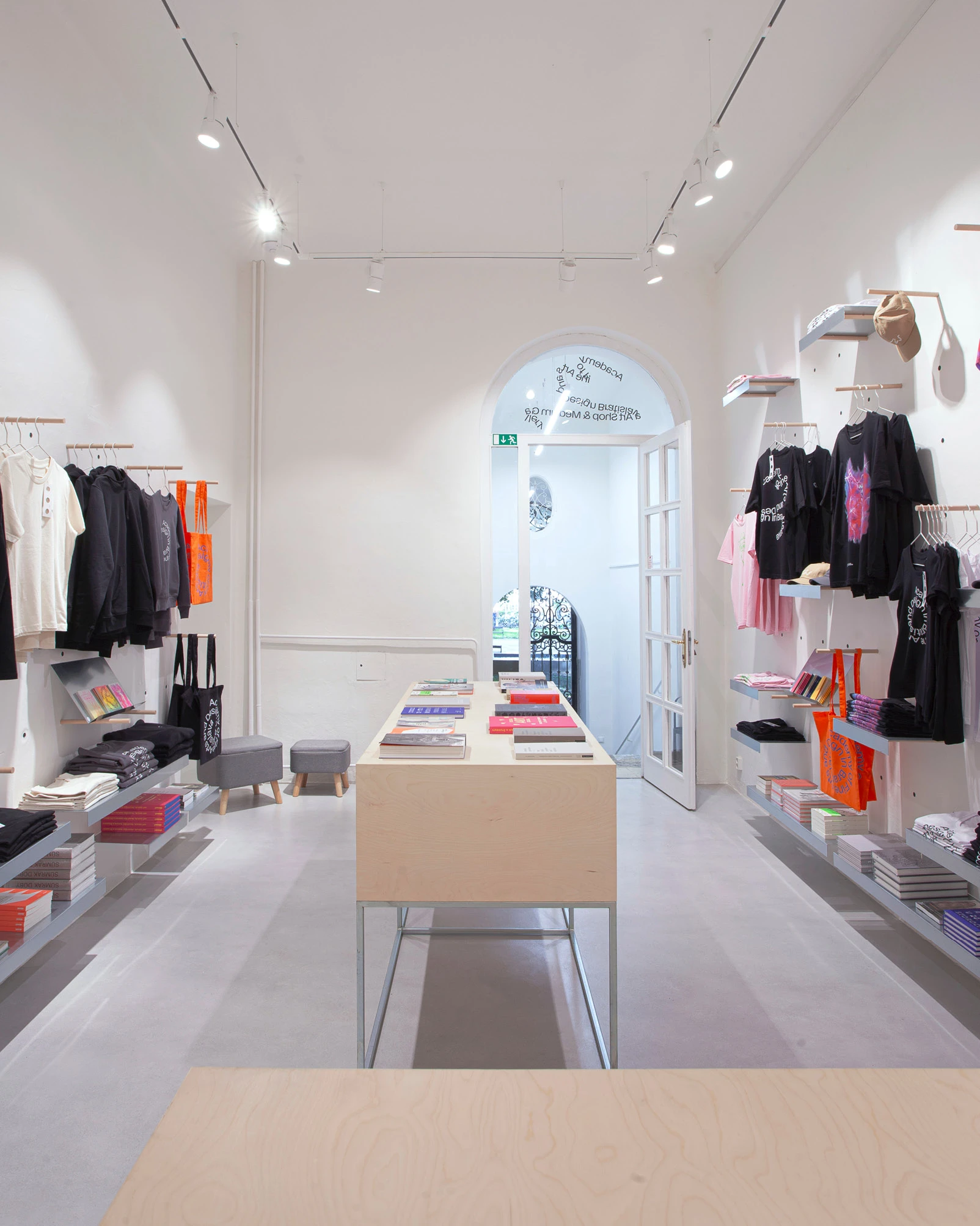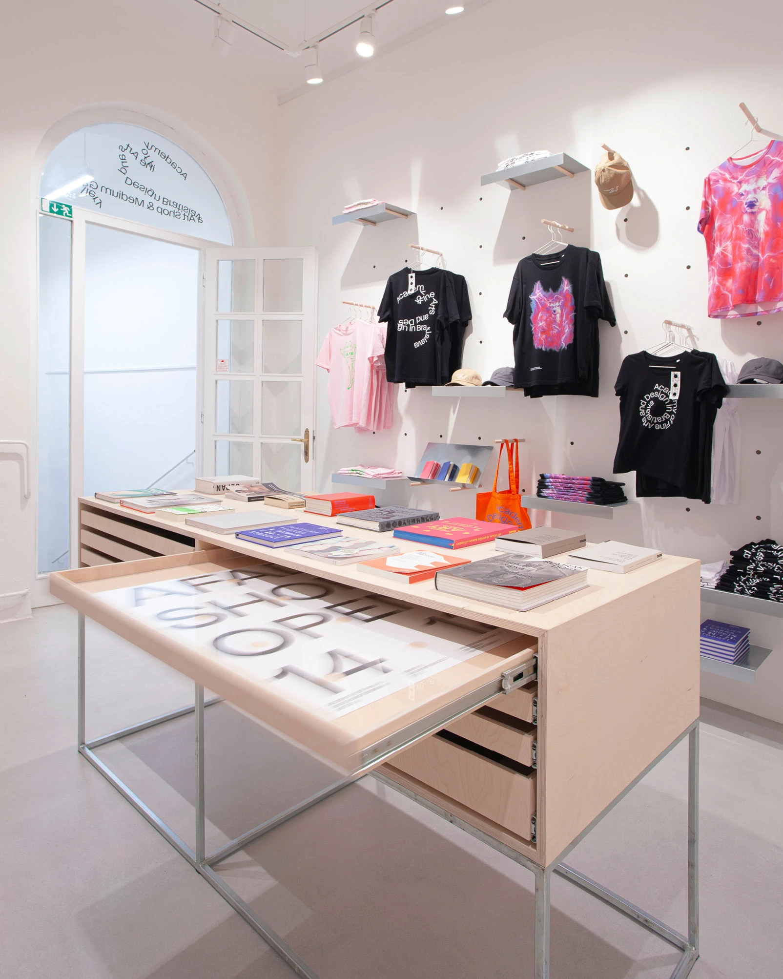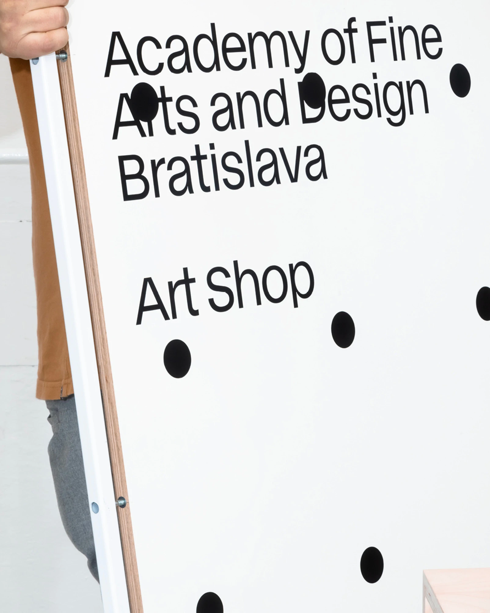 Architektúra a realizácia artshopu pre Vysokú školu výtvarných umení v Bratislave. Univerzálny priestor s modulovým systémom a stredovým pultom umožňuje variabilné usporiadanie objektov.