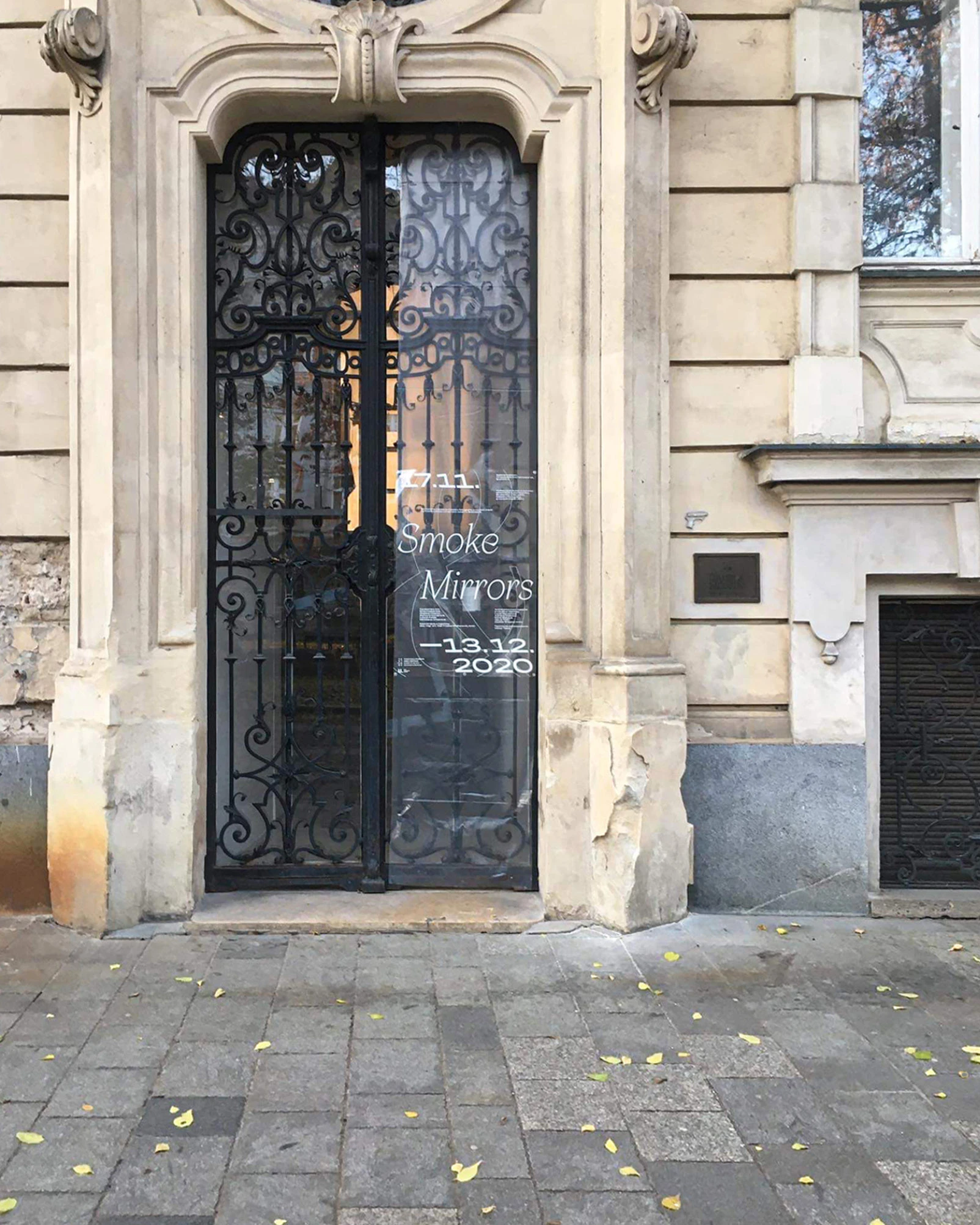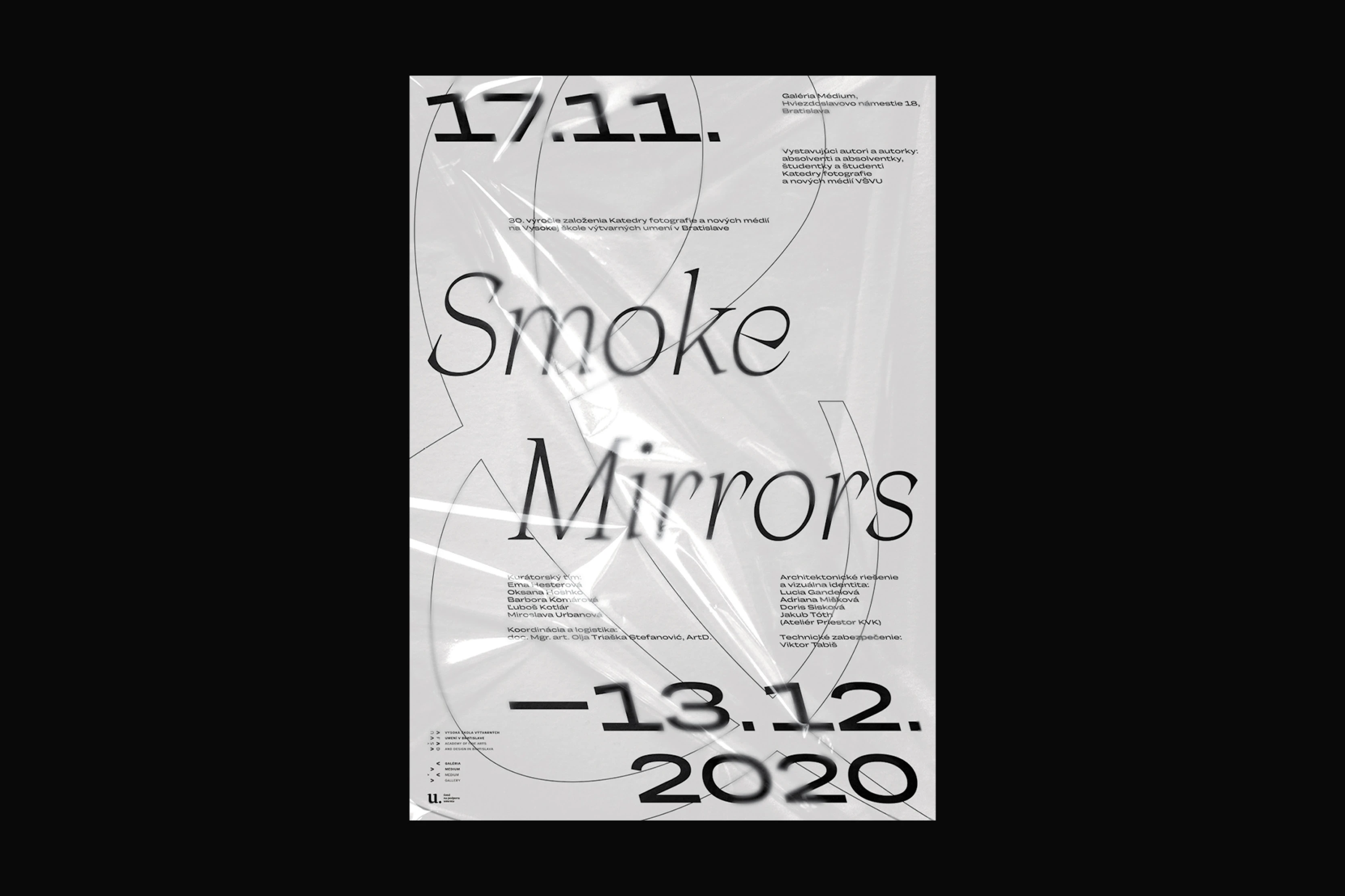 O výtvarnom prístupe napovedá samotný názov výstavy Smoke & Mirrors, ktorý pochádza z anglickej frázy a znamená klam, zahmlievanie. Výstavu sme realizovali ako kolektív autorov a autoriek na katedre Vizuálnej komunikácie VŠVU. Snahou bolo pozrieť sa na výstavu fotografie inak, vzdať sa využívania stien a umožniť prezentáciu fotografie v priestore. Výsledkom boli ľahké hliníkové konštrukcie, ktoré sa stali “zrkadlom“ stien, naznačeným v linke. Konštrukcie obalené transparentnou fóliou vytvorili inštalačný systém. Variabilnosť tohto systému umožnila hru s ním, preto bol každý predmet inštalovaný atypicky. Fólia sa stala reprezentantom opacity, zahmlievania a vytvárala v priestoroch zaujímavé priehľady. Fotografie sa vďaka tomu stali objektom, ktorý bolo možné pozorovať a skúmať zo všetkých strán.