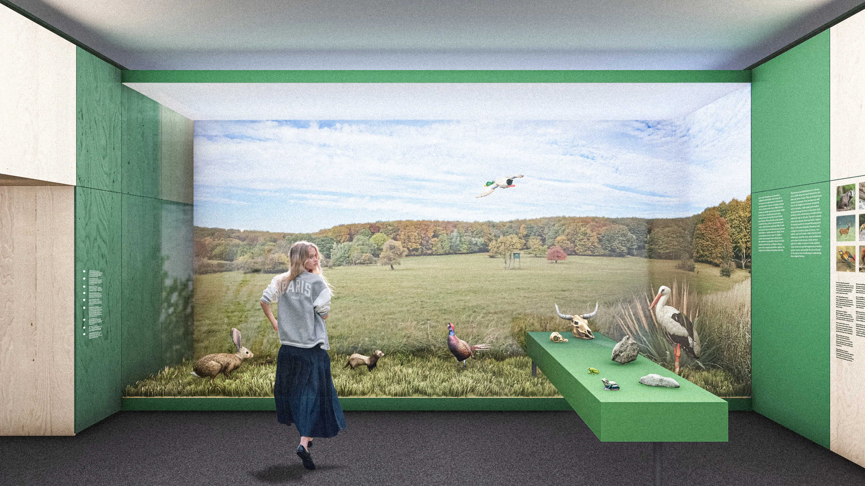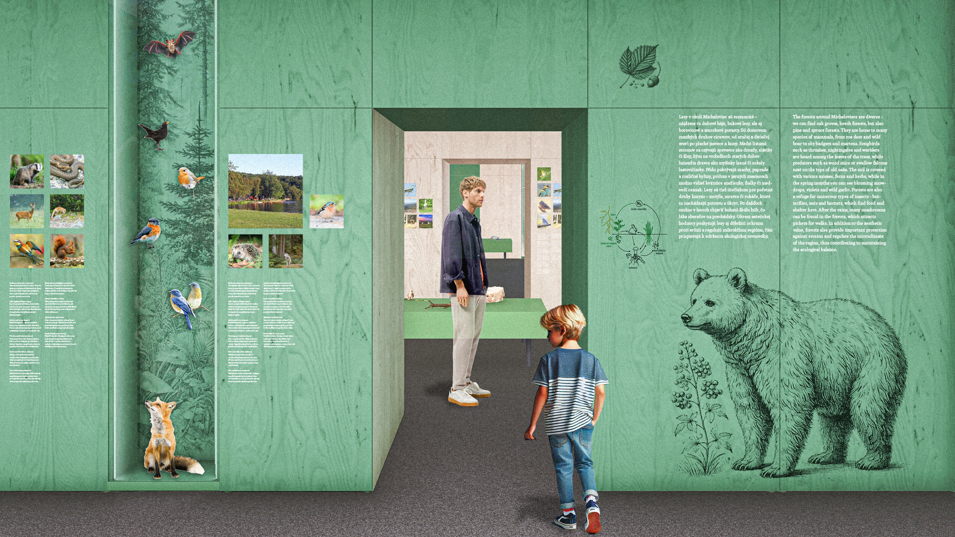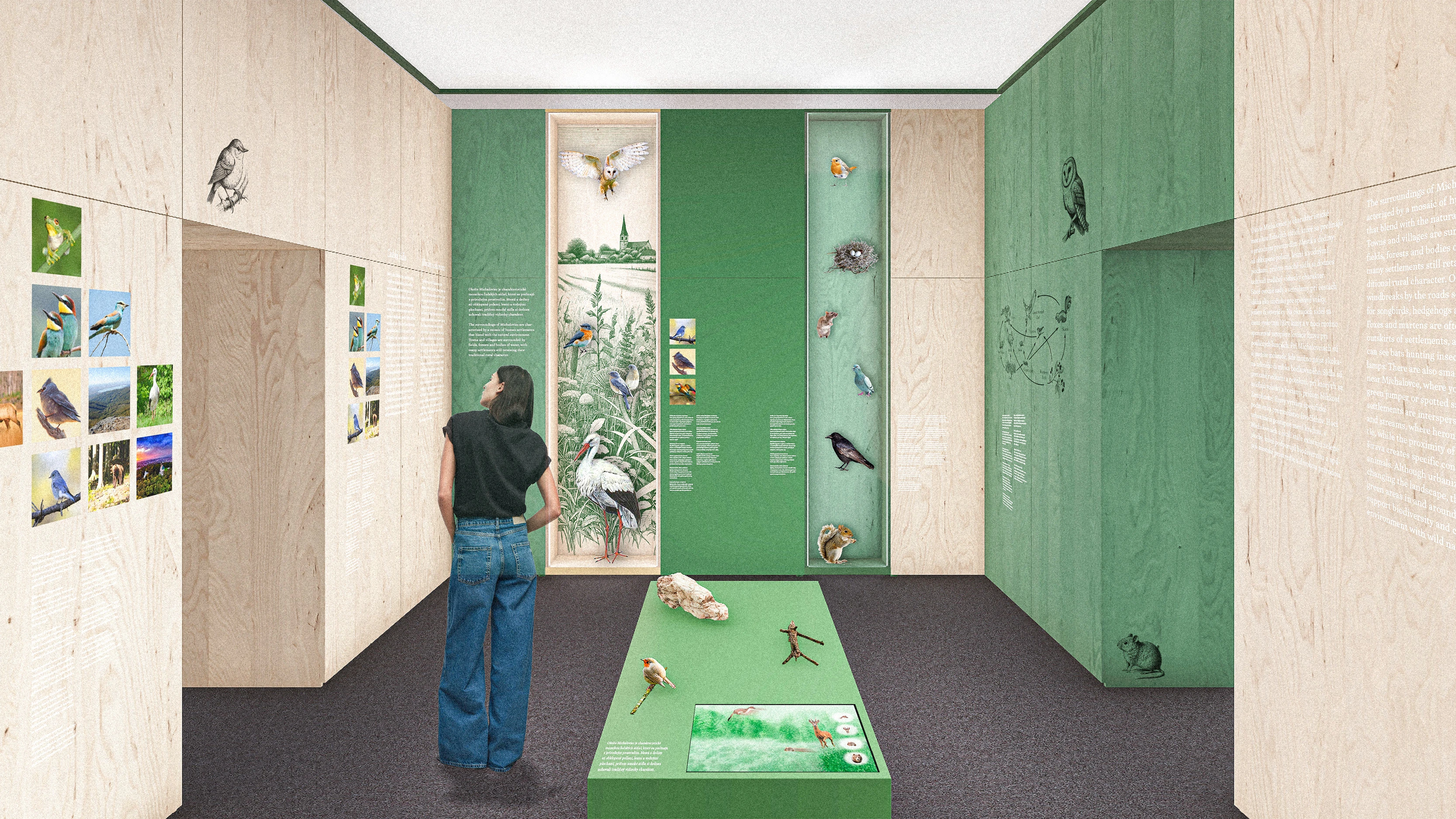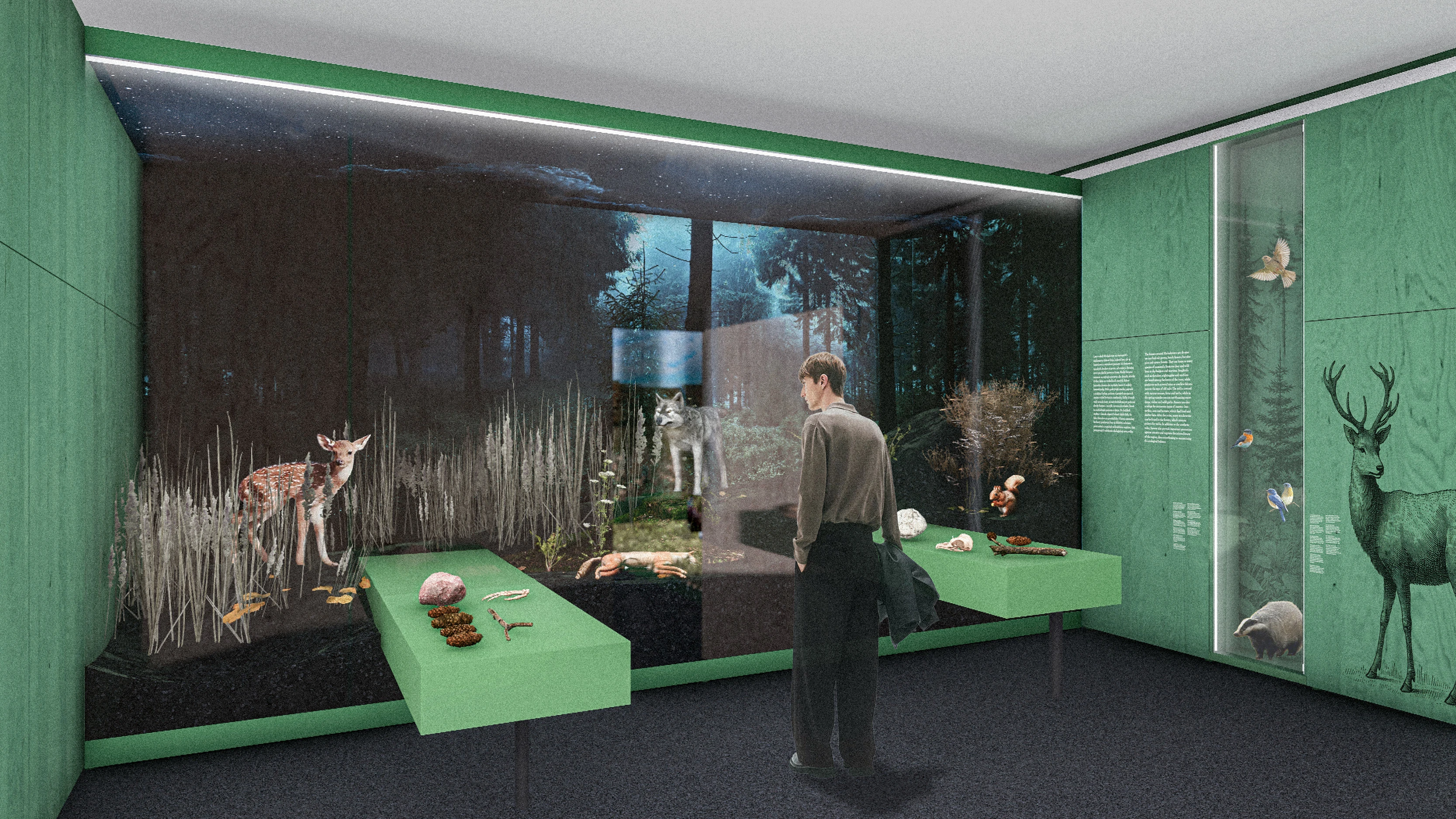 Architektonický návrh expozície vychádza z konceptu sondy do prírody. Základ tvorí modulárny systém vitrín a panelov integrovaných do stien, ktoré tematicky členia priestor podľa biotopov Zemplína. Interiér pracuje s kontrastom medzi historickým prostredím kaštieľa a súčasnými materiálmi ako preglejka a textil. Výstavný mobiliár je navrhnutý tak, aby umožňoval fyzické aj digitálne objavovanie – obsahuje šuflíky s prírodninami, dotykové displeje, zvukové stopy aj projekčné plochy so závesnými tieňovými efektmi. Farebná schéma a osvetlenie sú prispôsobené charakteru jednotlivých biotopov. Ilustrácie v mierke dopĺňajú edukatívny obsah a podporujú orientáciu.