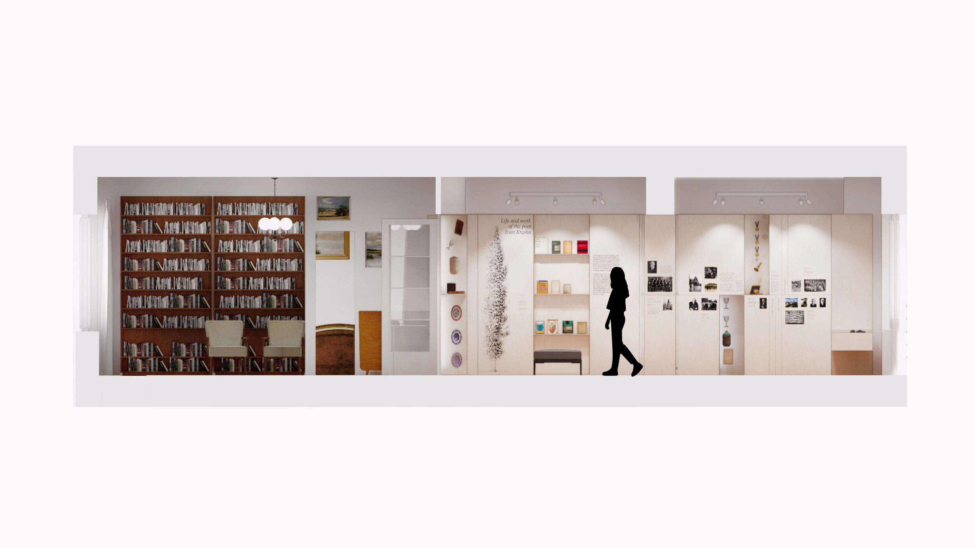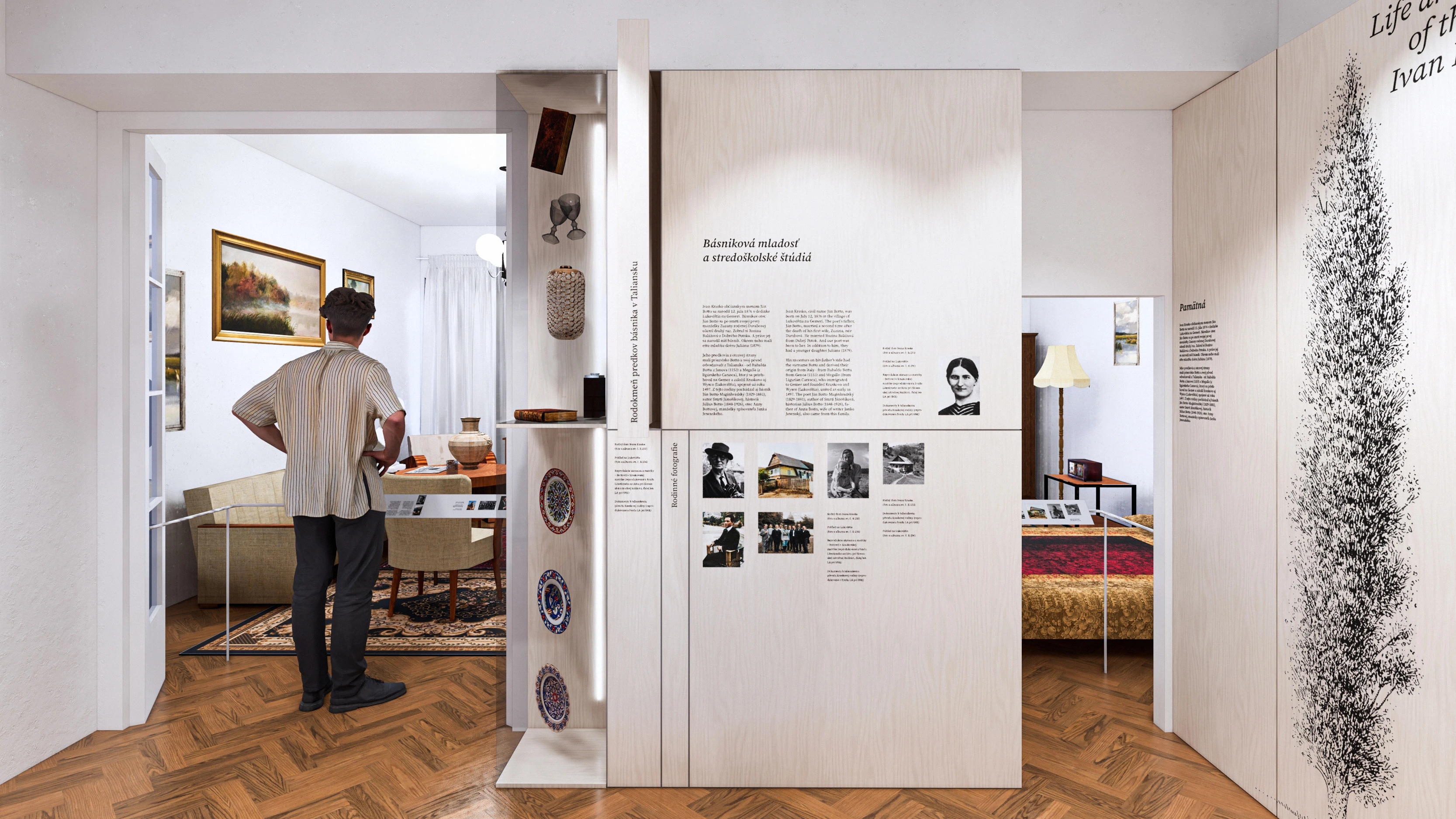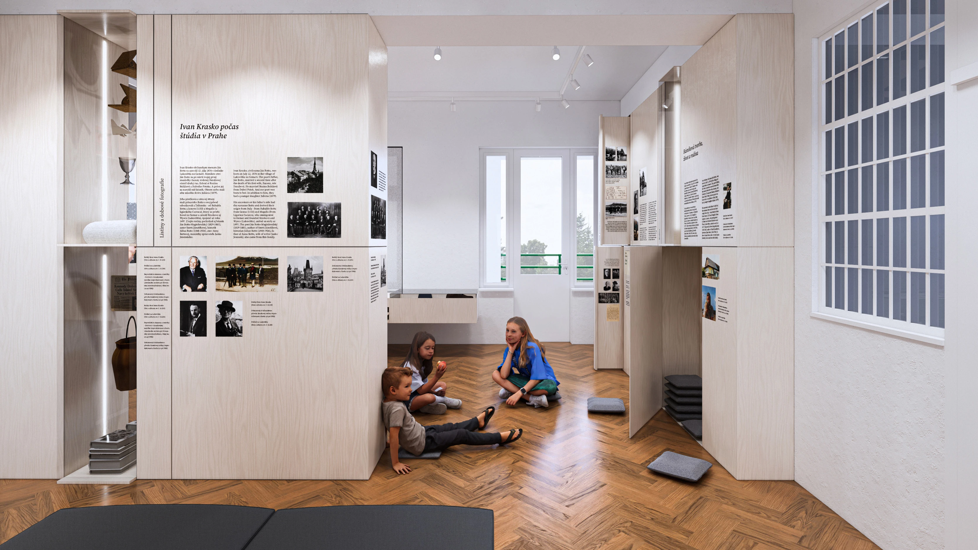 Súťažný architektonický návrh expozície o básnikovi Ivanovi Kraskovi. Náš koncept prepája knižnicu s časovou osou jeho života v minimalistickom priestore s interaktívnymi panelmi.