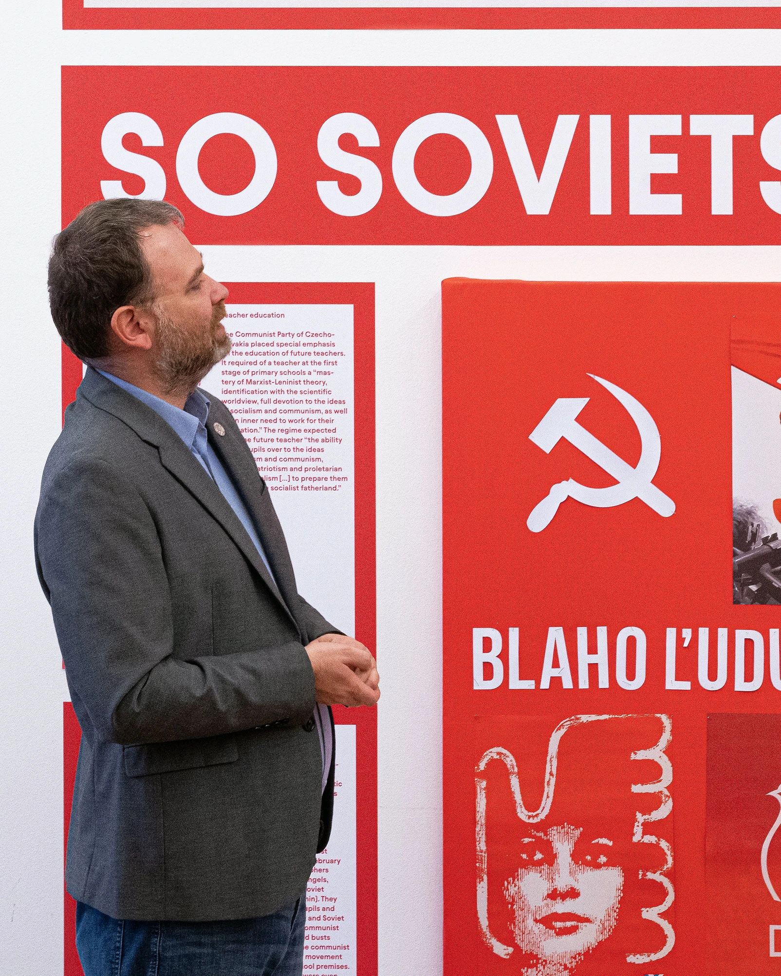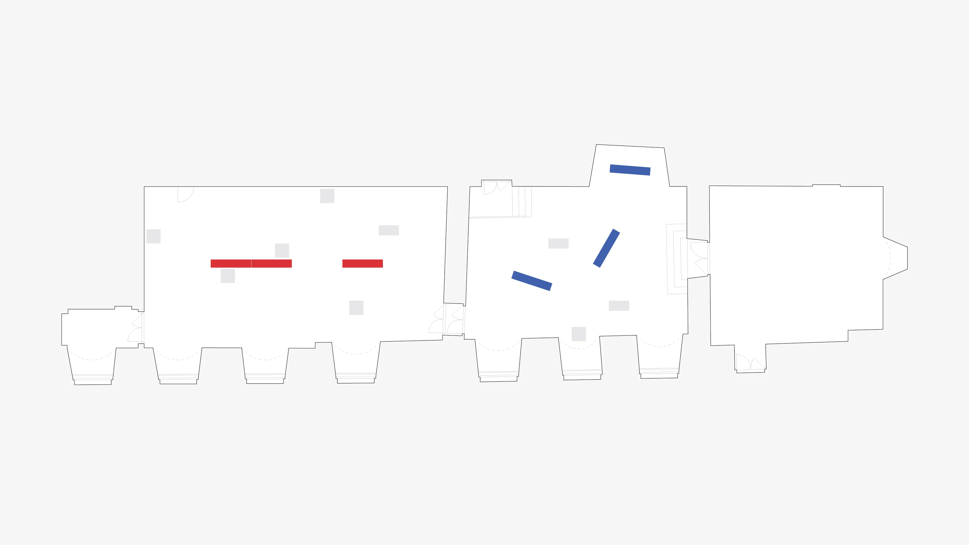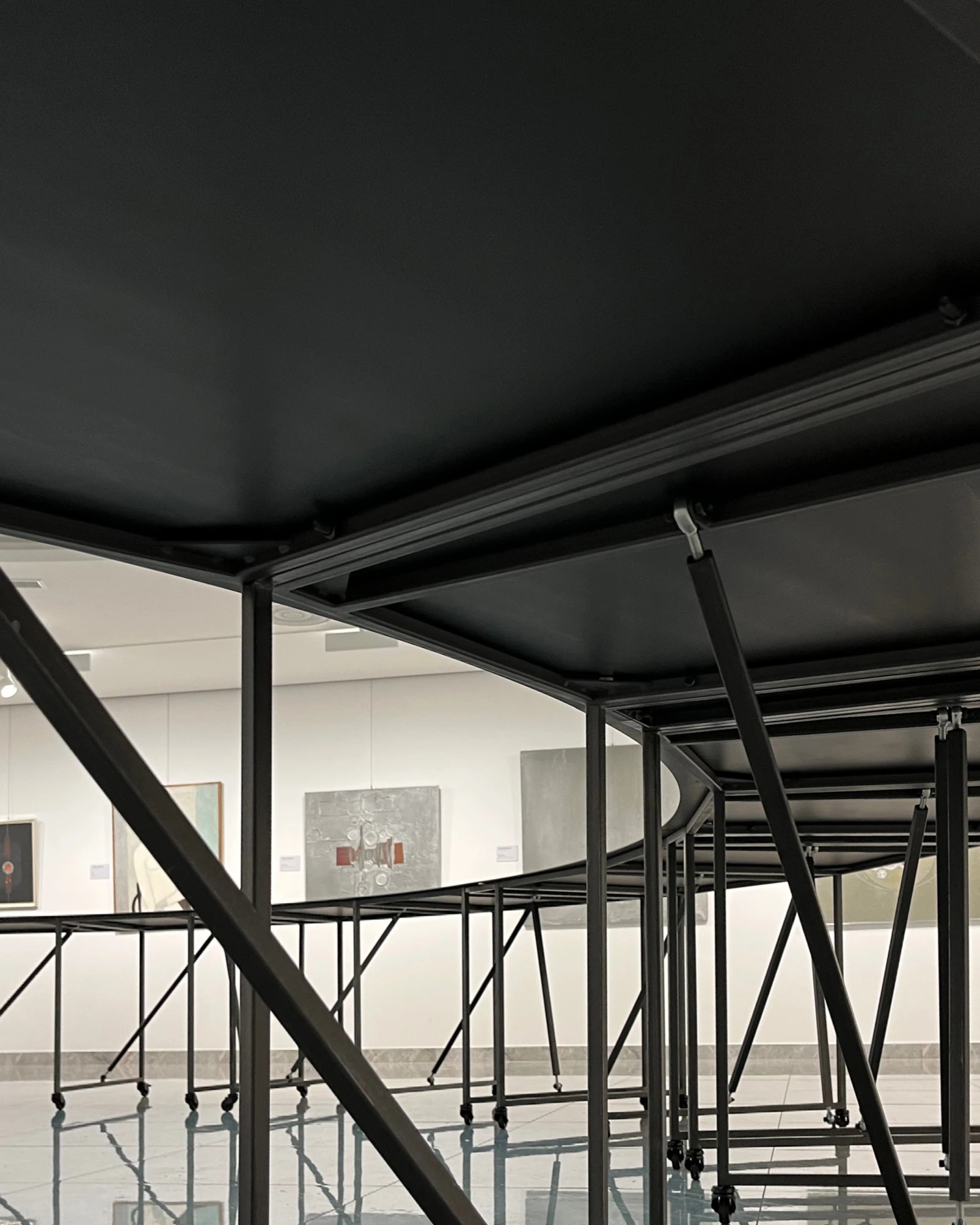 Architektúra výstavy pracuje s motívom transportných debien, ktoré sa po otvorení premieňajú na výstavný mobiliár. Ich robustná konštrukcia, jednotný materiál a sýty odtieň červenej vytvárajú výraznú vizuálnu vrstvu, ktorá kontrastuje s kamennou architektúrou priestoru. Kompozícia pôsobí na prvý pohľad náhodne, no každý objekt má presne určené miesto. Výstavný jazyk tak evokuje dočasnosť, pohyb a neustálu premenu – akoby výstava práve dorazila, otvorila sa a kedykoľvek sa mohla znova zbaliť.